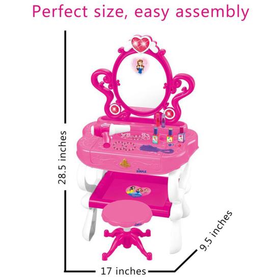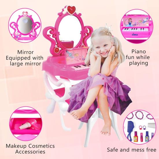 Beautiful Vanity Salon Activity Playset with Big Mirror and Stool to sit on, Comes with 16 pretend fashion and make-up accessories along with a functional 18 key piano keyboard, and flashing lights