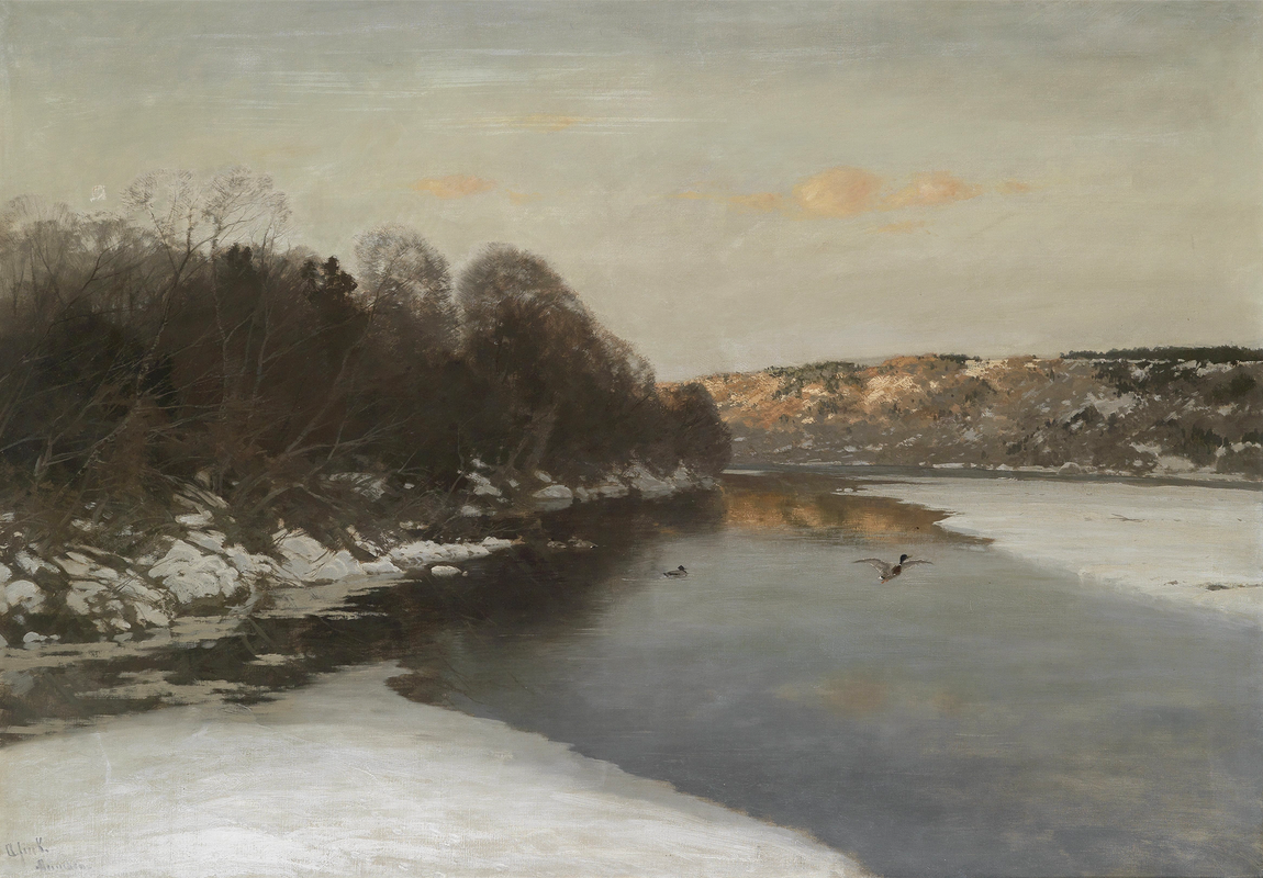 Winter River Stillness – A graceful depiction of a snow-lined river under a soft sky, where ducks ripple the quiet water and bare trees frame the fading winter light.