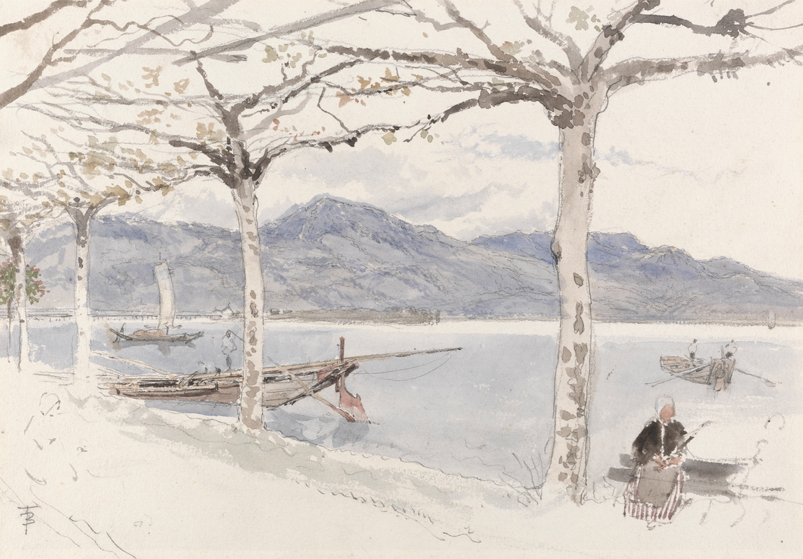 This poster captures a quiet lakeside moment with gently moored boats, still waters, distant mountains, and a seated figure on a shaded promenade. The delicate watercolor strokes convey the silence and calm of a serene European lakeside town.