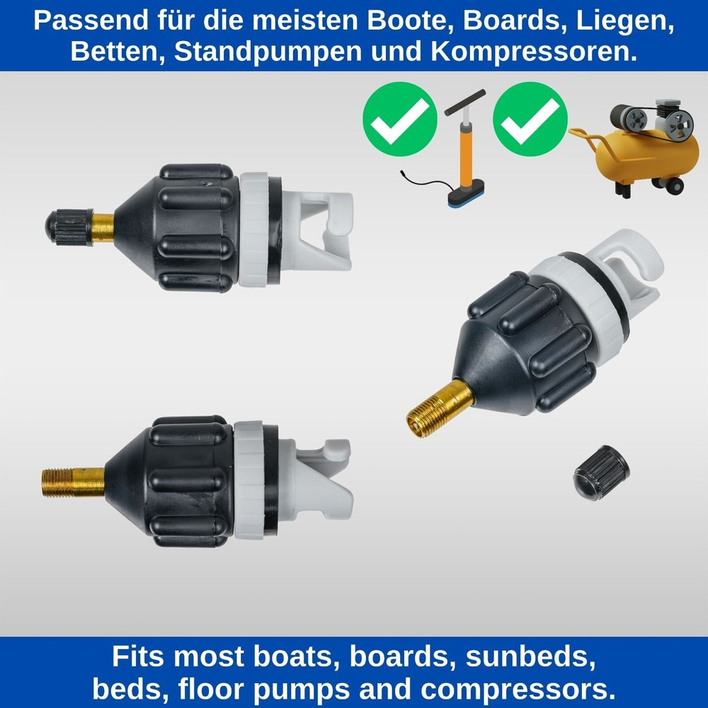 Dann brauchst du für das Aufpumpen des Sportbootes den passenden Ventil Aufsatz.