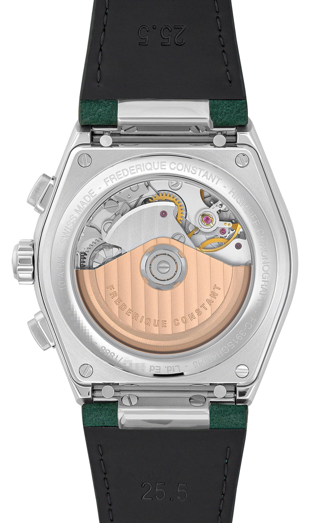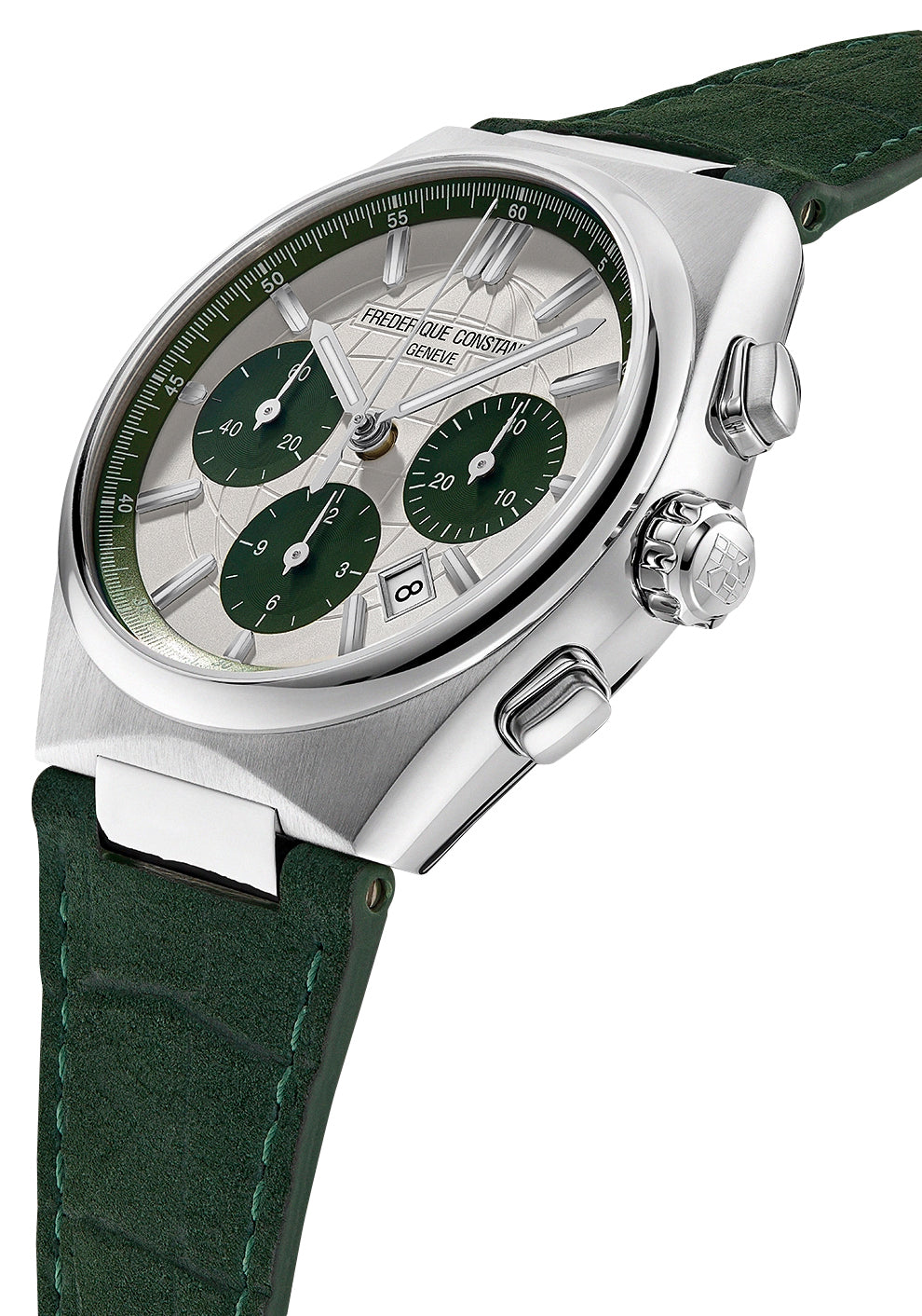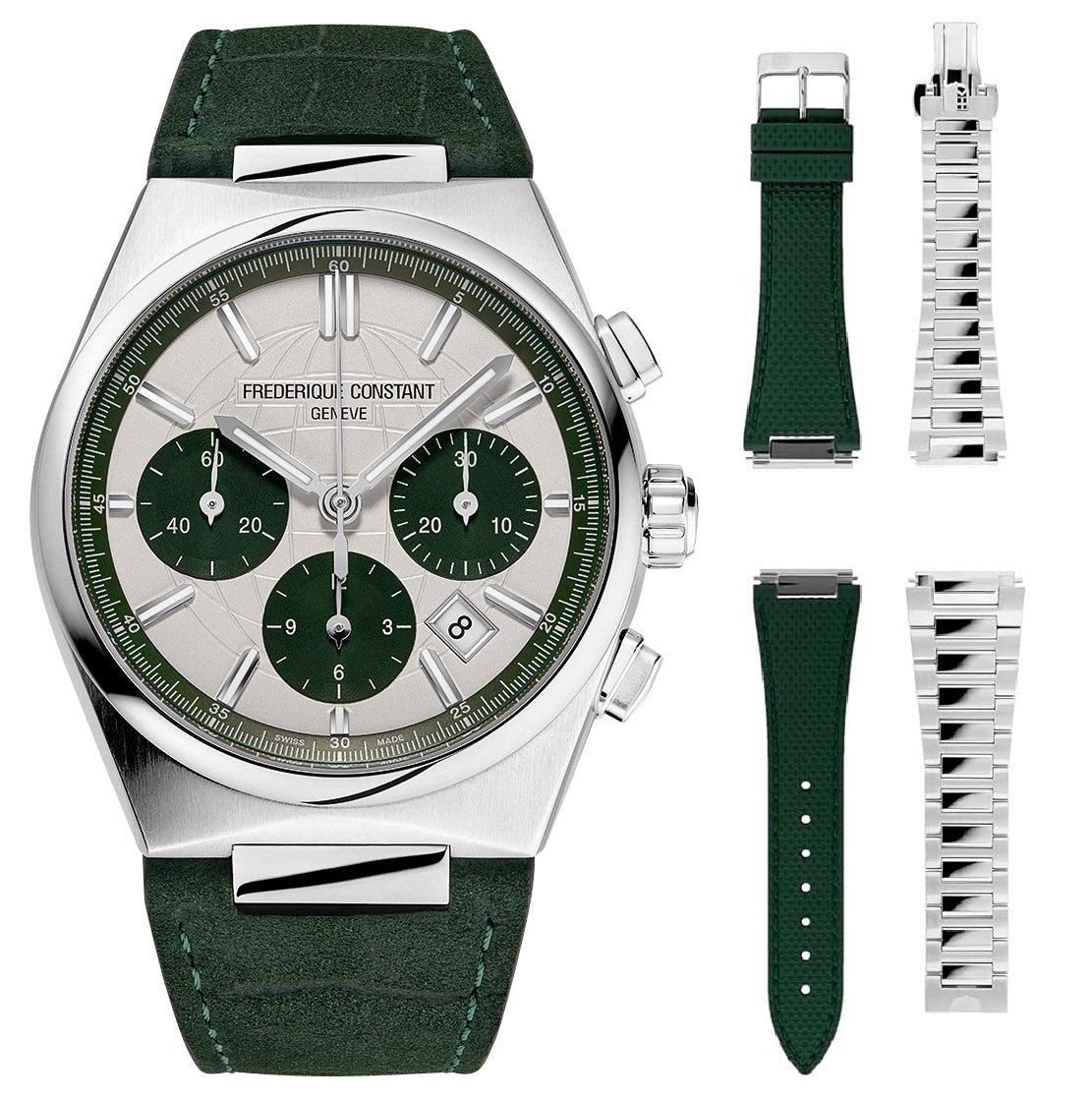 Launched over 20 years ago and based on revised and improved fundamentals acquired from Frederique Constant's lengthy experience, the Highlife collection sports a new case design, interchangeable straps and a detailed, decorated dial. This gents' Highlife Chronograph is a brand new variation of the brand's showcase collection in celebration of its 25th anniversary and a limited edition of only 1,888 pieces. It features a 41 mm stainless steel case that holds a silver-tone opaline "panda" brass dial under a scratch-resistant sapphire crystal. It has silver-tone and luminescent pencil hands and applied indices as hour markers along the perimeter of its central globe motif, and is bordered by a dark green chapter ring. Three dark green subdials present 60-second, 30-minute, and 12-hour counters while the beveled date window is between the 4 and 5 o'clock positions. Time and chronograph functions are operated via the fluted and signed crown with pushers along the right side of the case. This watch is equipped with a dark green leather strap that sports a smoothly integrated design and is secured by a stainless steel signed buckle. It also comes with 2 interchangeable bands: a green rubber strap and a stainless steel bracelet for a variety of looks and styles. Visible underneath the exhibition caseback is the inscribed limited edition number and caliber FC-391, a Swiss automatic chronograph movement beating at 28,800 vibrations per hour generating up to 60 hours of power reserve and is water-resistant up to 100 meters/330 feet.