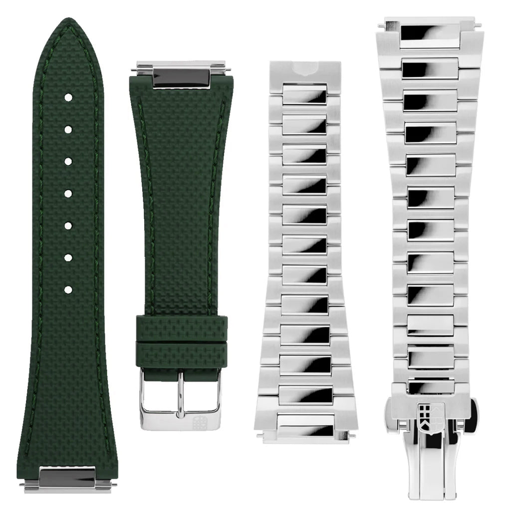 | Material | Dark Green Calfskin Leather (Nubuck Finishing/Crocodile Pattern) with Interchangeable Green Rubber and Steel Bracelet |