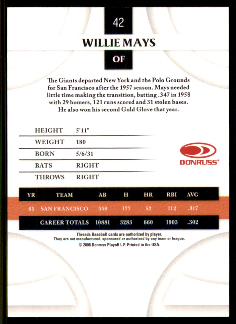 2008 Donruss Threads #42 Willie Mays San Francisco Giants