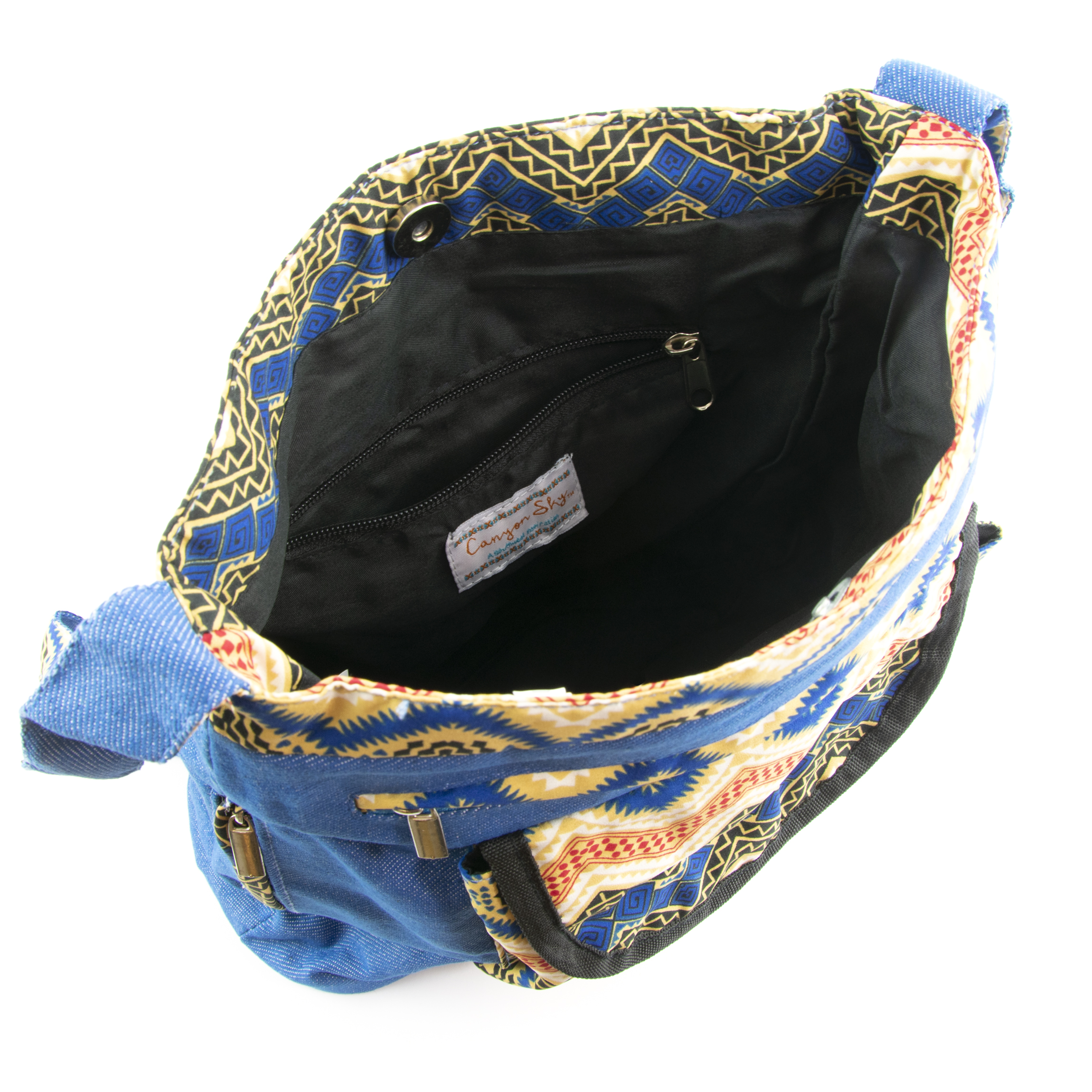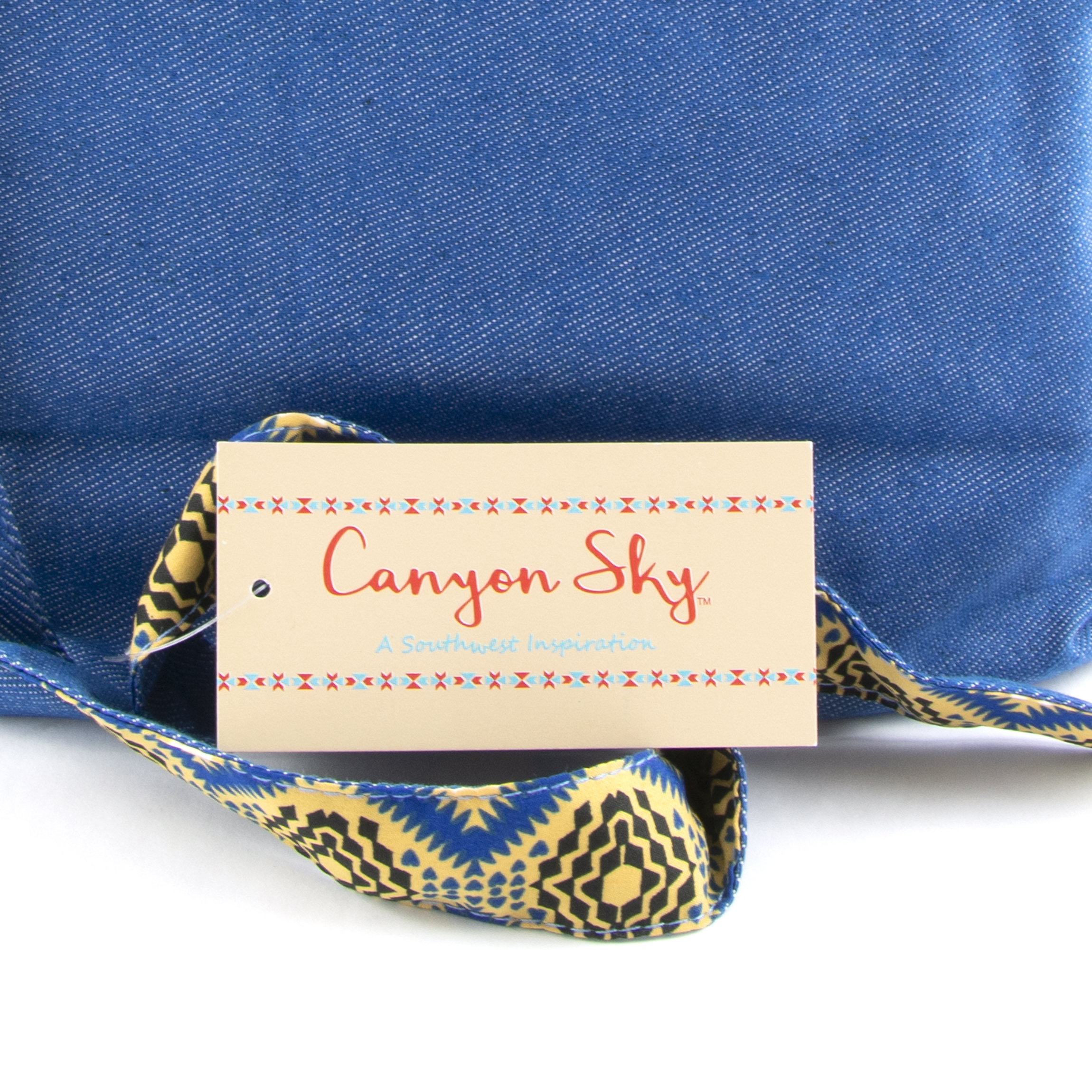 This coordinated accessory set from Canyon Sky includes a handbag and matching scarf with an Aztec inspired design. The blue denim shoulder bag is detailed in an Aztec patterned front pocket and trim, including the inside of the strap. The 1-inch wide shoulder strap measures 20-1/2 inches long for a comfortable over the shoulder or crossbody carry. The bag has ample storage with a front pocket with a snap closure, a front zip pocket and two side zip pockets. The roomy interior is lined and has a zip pocket and magnetic snap closure. The coordinating fashion scarf has the same Aztec pattern and is made of 100% polyester. Handbag measurements: 12" W x 11.5" H x 4" D. Scarf measurements: 20" W x 70" L.
