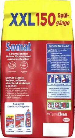 Somat Classic Pulver ist ein Geschirr-Reiniger mit umweltfreundlicher, phosphatfreier Formel. Er reinigt mit Hilfe von Zitronensäure und bringt 100 % Leistung: selbst starke Schmutzkrusten werden kraftvoll entfernt, z. B. Fett- und Stärkereste von Nudeln, Kartoffeln oder Reis. Auch Tassen und Gläser mit hartnäckigen Tee- und Kaffeerändern werden zuverlässig von Ablagerungen befreit. Ein integrierter Langzeit-Glasschutz beugt zudem Glaskorrosion vor - so bleiben Ihre wertvollen Gläser lange wie neu.
