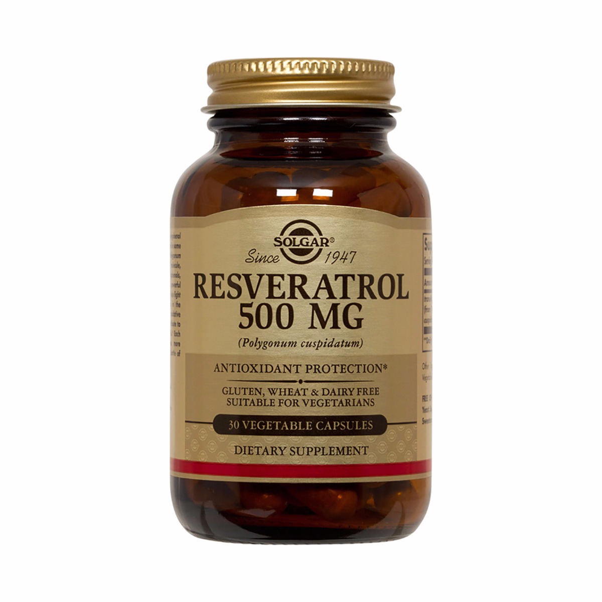 Resveratrol is a naturally occurring polyphenol found in red wine, peanuts and in some plants, including the herb Polygonum cuspidatum. It is a small molecule, classified as a stilbene. Polyphenols, such as resveratrol, possess beneficial antioxidant properties that help fight free radicals in the body. Free radicals can cause oxidative stress which may damage cells. Each vegetable capsule contains more resveratrol than a typical bottle of red wine