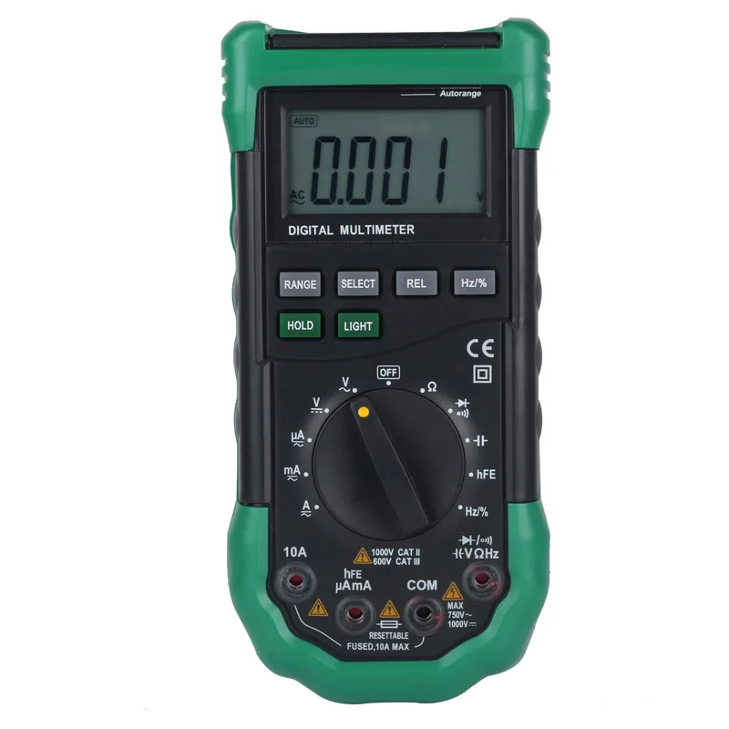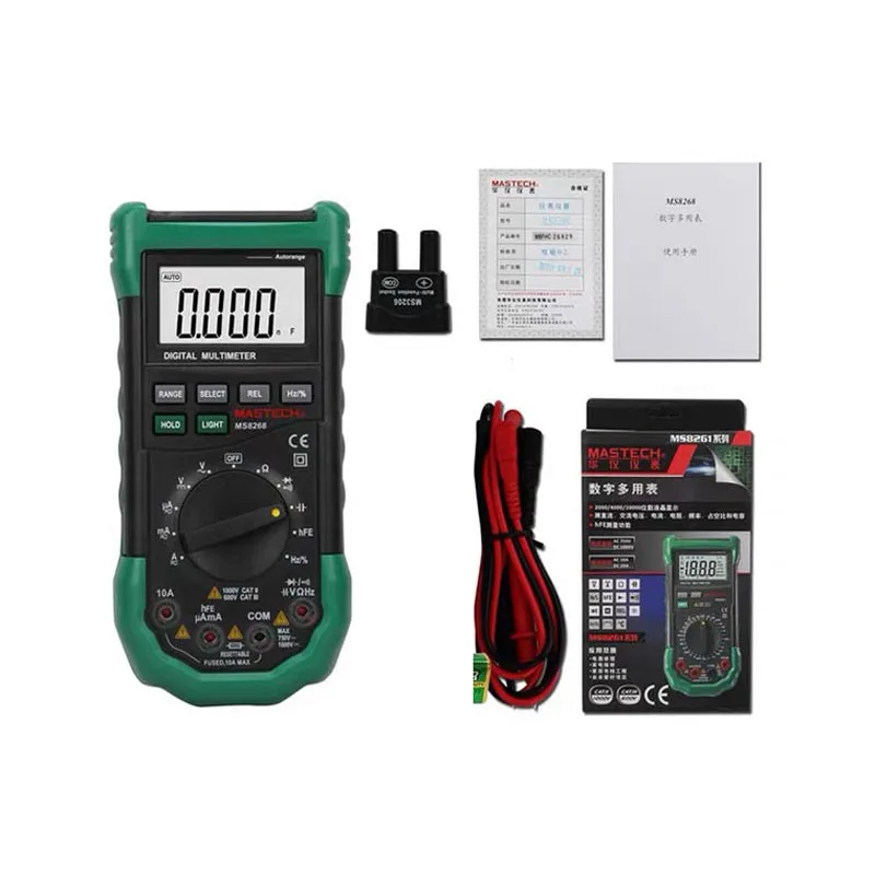 This Professional Auto-range Digital Multimeter (MS8268) is manufactured by MASTECH which is one of the largest and most well-known manufacturers of high quality electronic measuring instruments.It has multi-functions to measure and test various parameters including DC and AC voltage, DC and AC current, resistance, capacitance, frequency, duty circle, transistor, diode and continuity test.