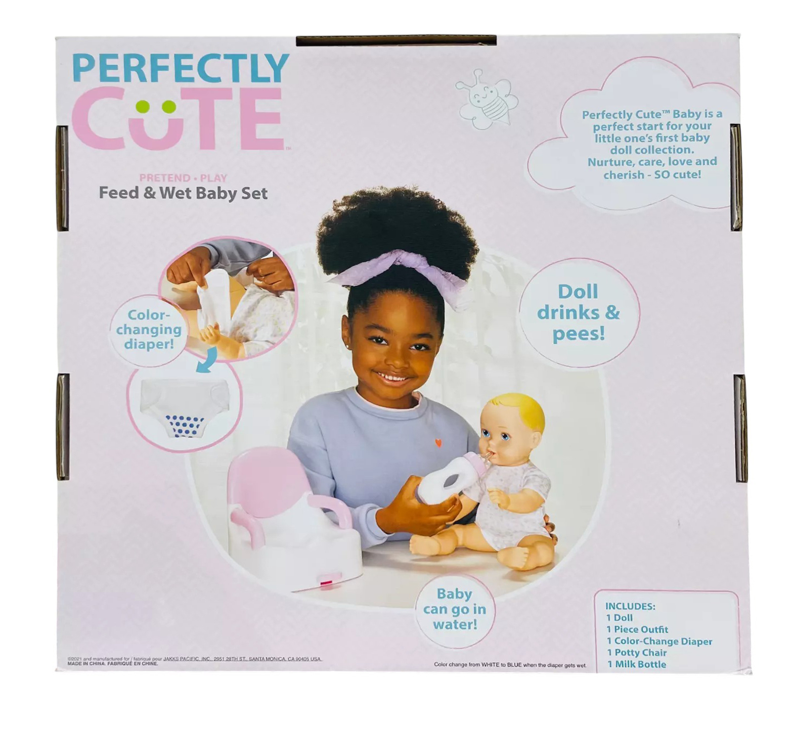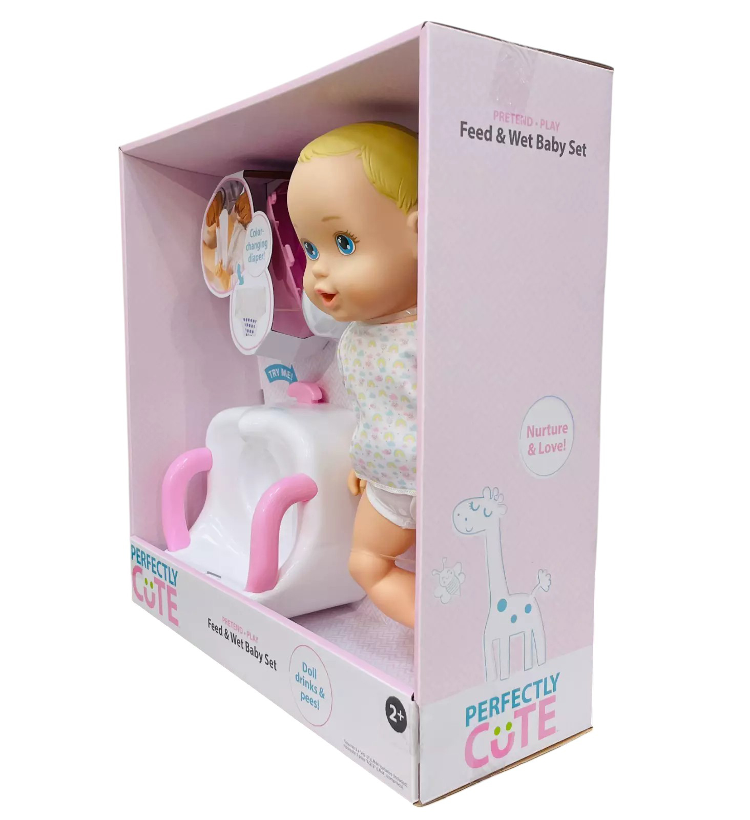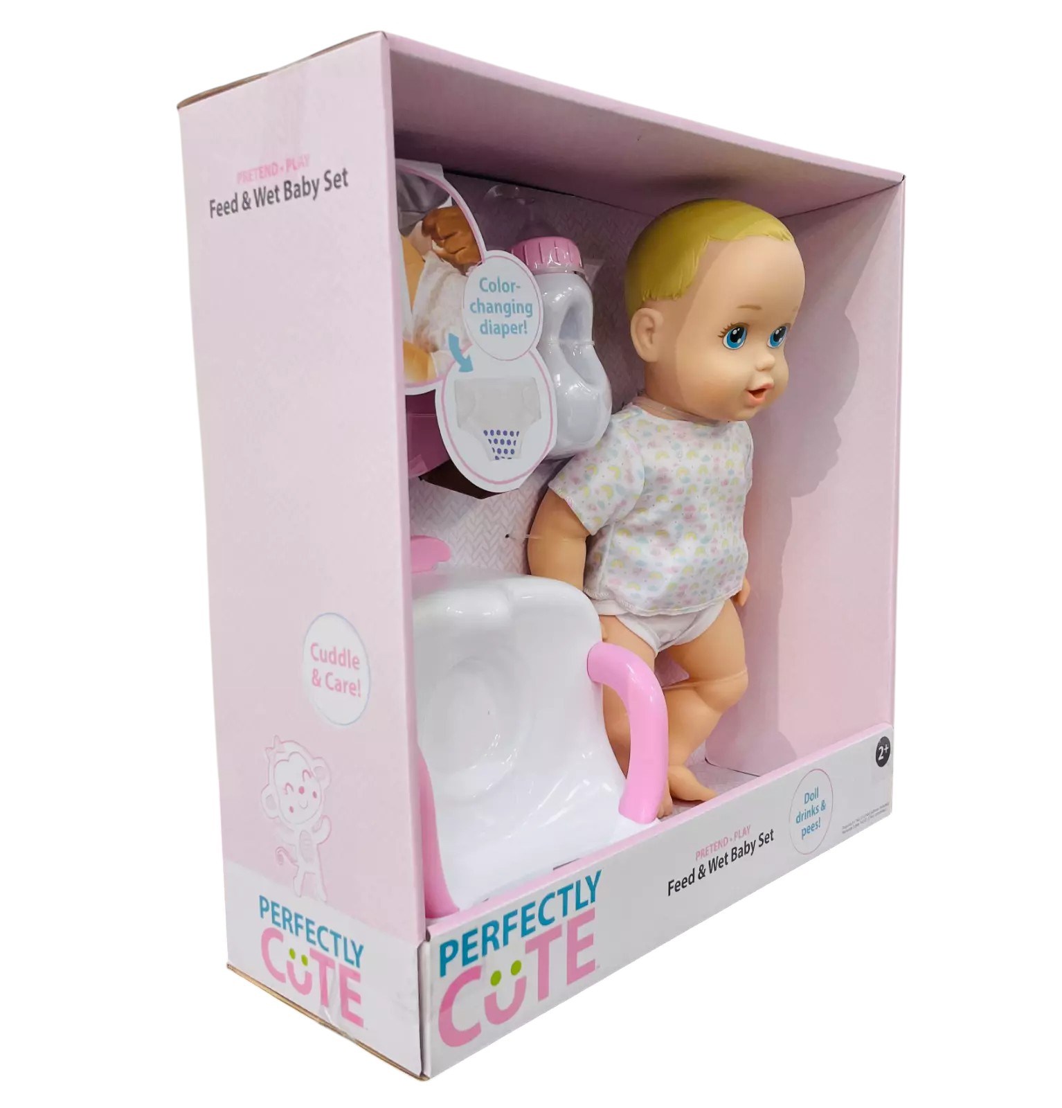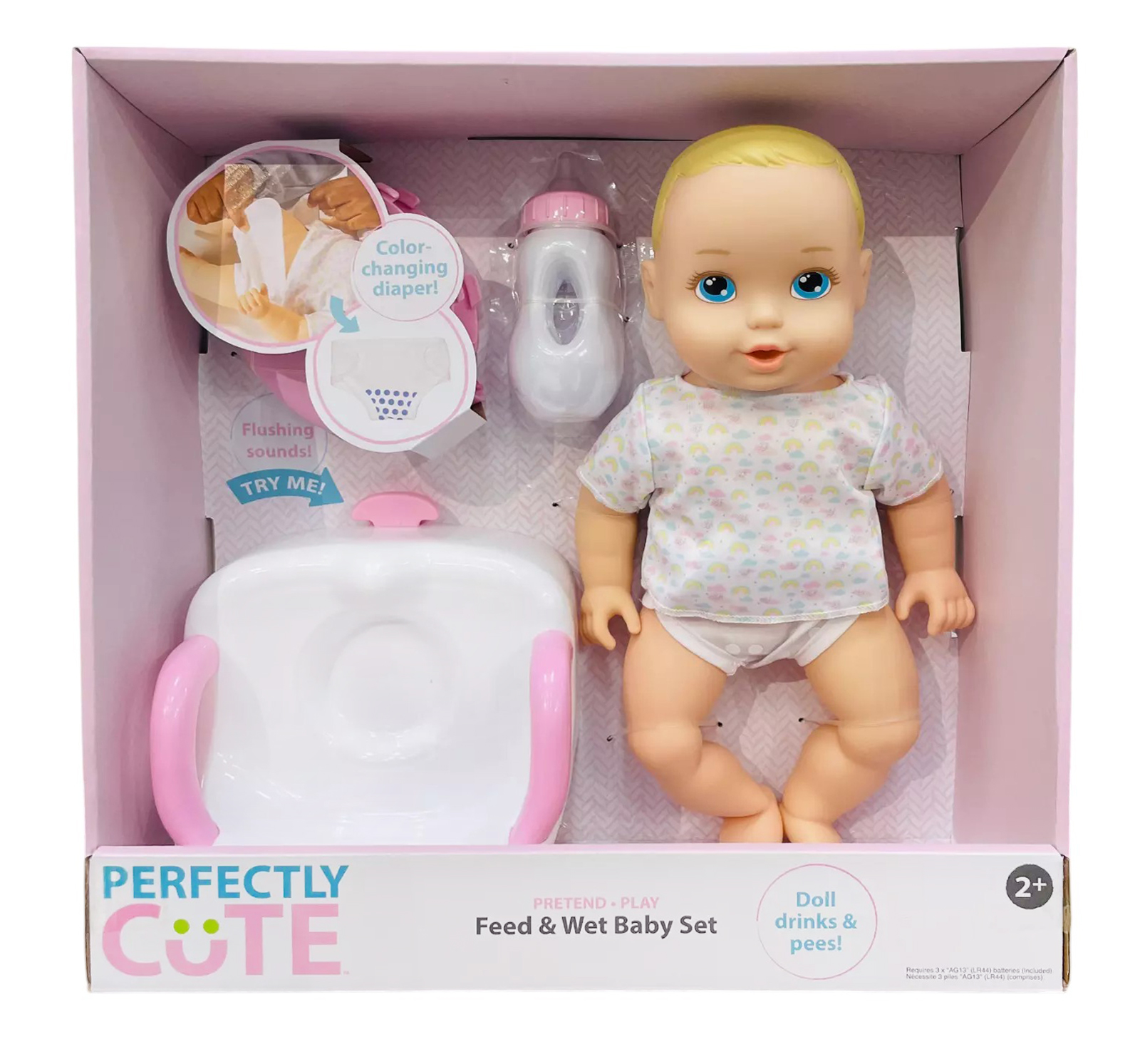 Perfectly Cute Baby dolls and accessories are a perfect start for your little one’s first baby doll collection. The baby dolls are sweet, soft and cuddly with adorable outfits and accessories that are sure to win the heart of your child. Nurture, care, love and cherish—SO cute! This Feed & Wet set includes everything you need to care for your little one. Feeding & potty time is super fun with the Perfectly Cute Feed & Wet Baby Doll set. Feed the baby water from its bottle and the baby "wets" its diaper. The diaper will even change colors! Adorable set features a snuggly sweet Perfectly Cute 14" Baby Doll in a delightful removable shirt, bottle, potty seat, and a diaper. Requires 3 AG13 batteries, not included