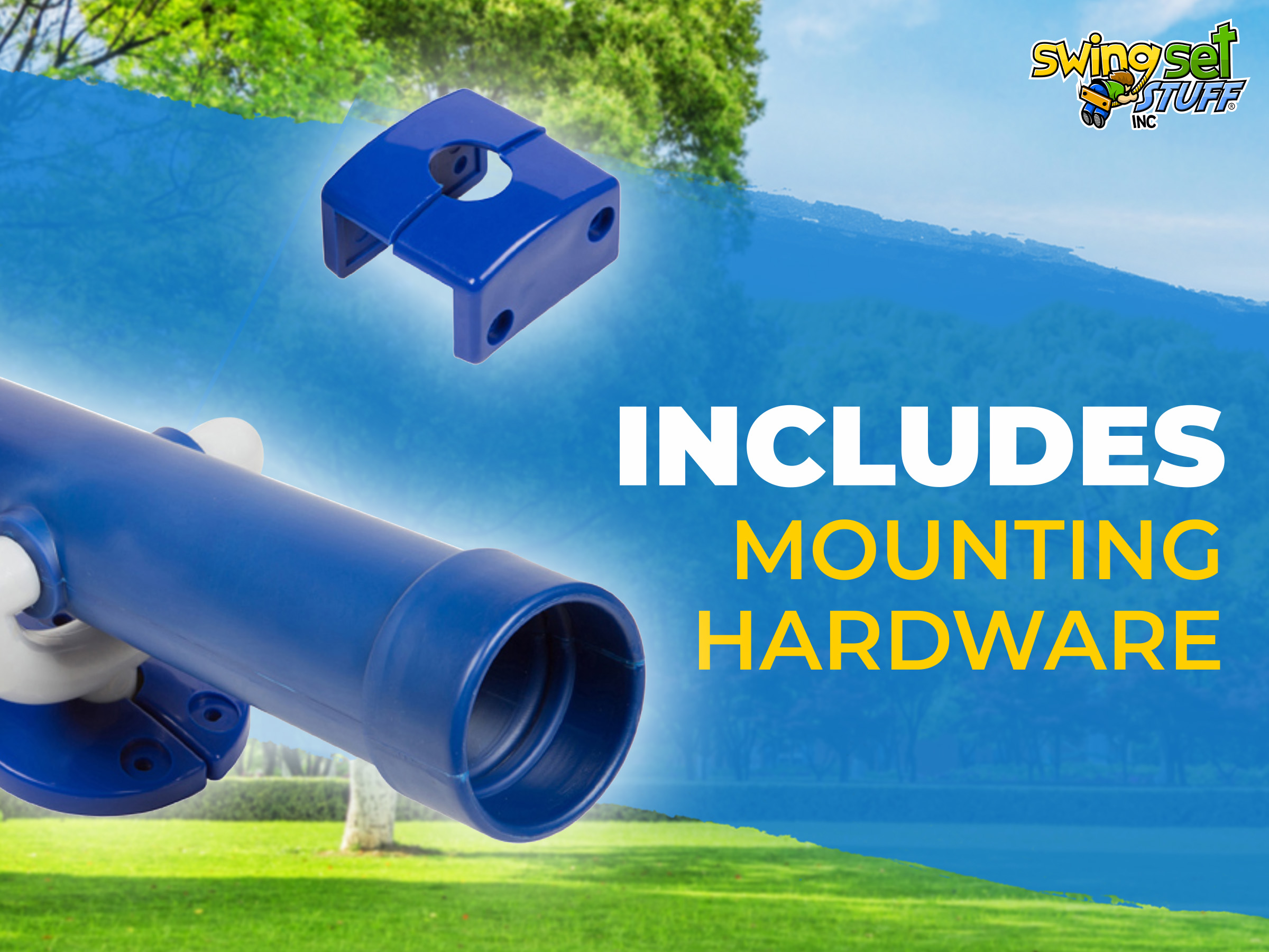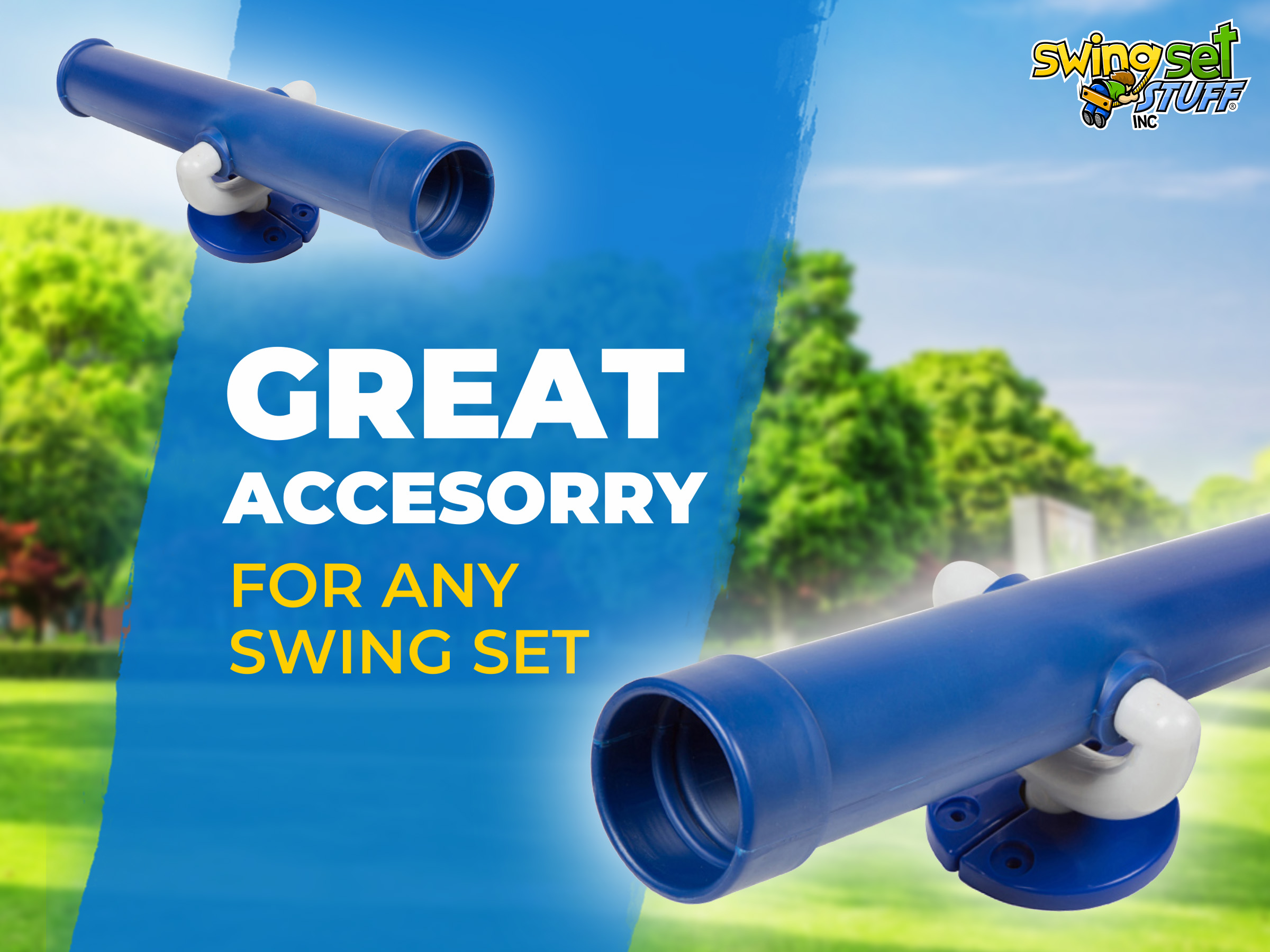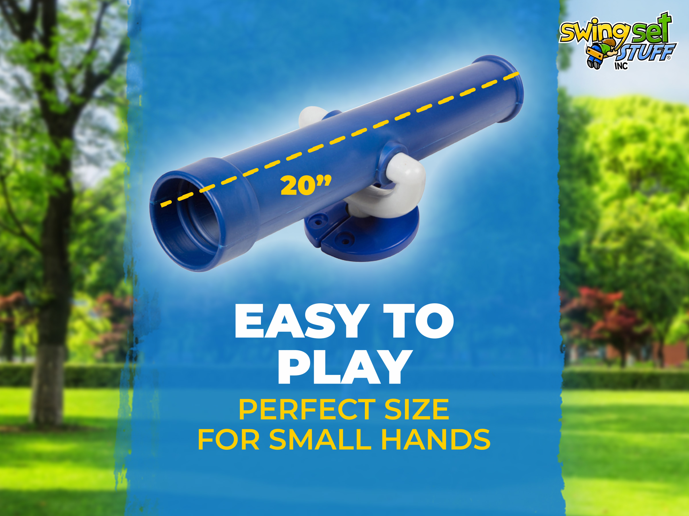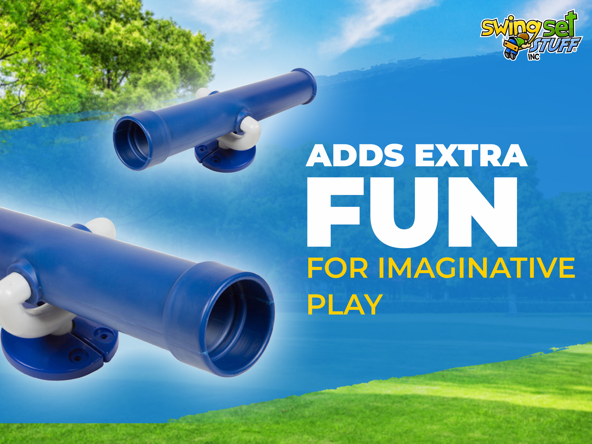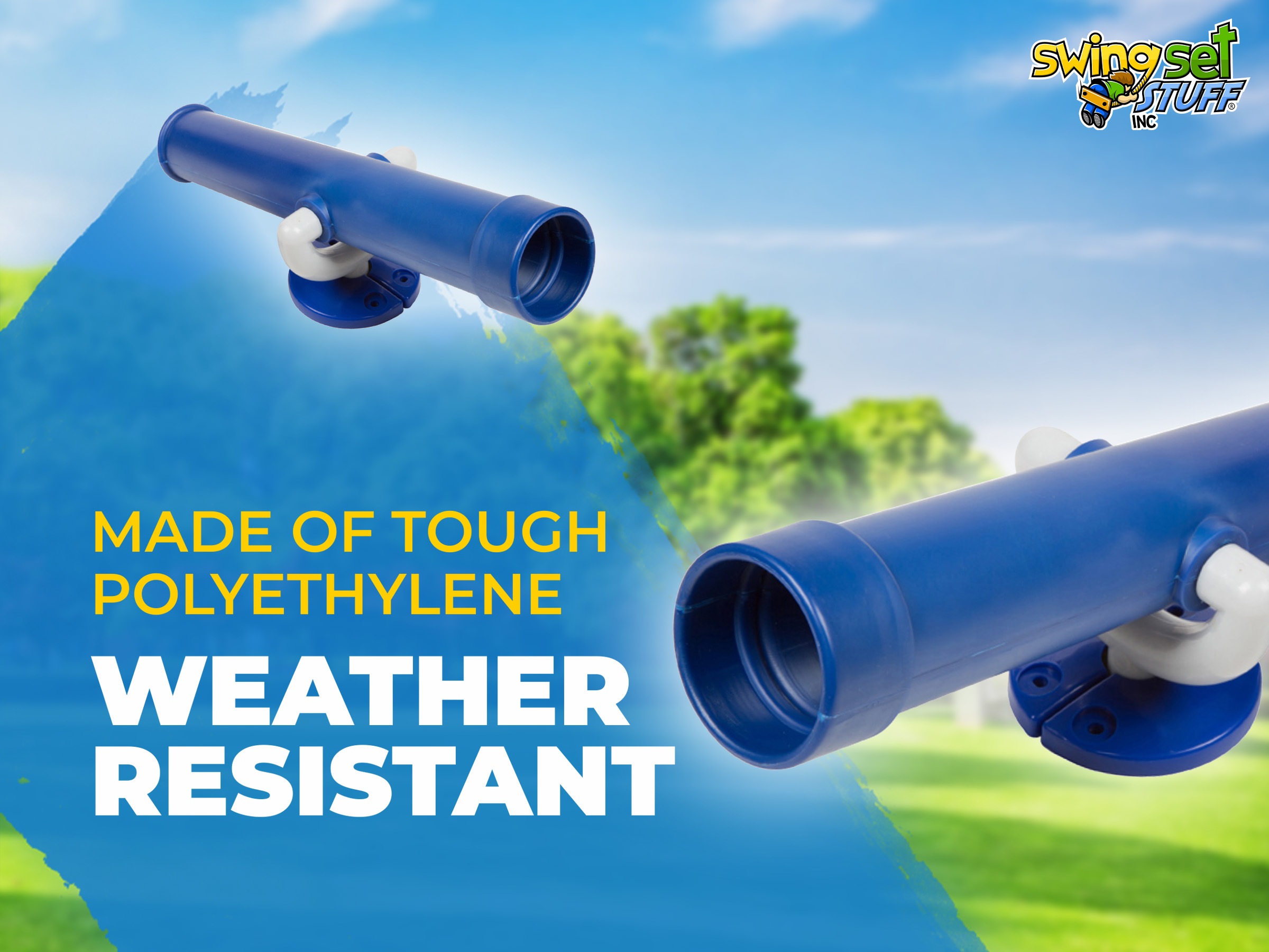 This telescope comes complete with all mounting hardware. It is made of tough polyethylene to withstand a lot of play time and the weather. There is a clear plastic non-magnifying lens on both ends. You can mount this telescope to any wooden set with ease. Don’t have a wooden set? These are easy to mount just about anywhere.