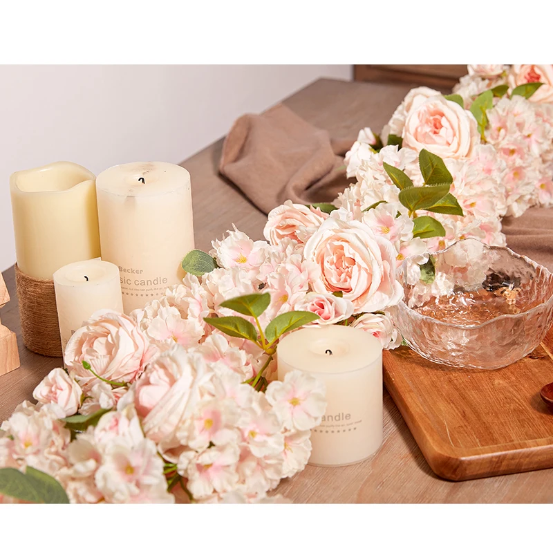 Size: Whole length about 185cm/6.07ft, size of rose: 8cm/3.14in, size of rose bud: 4cm/1.57in, size of cherry blossom: 4cm/1.57in, size of two kinds of leaves: 4-6cm/1.57-2.36in. (1pc with 7 pink austin roses, 14 rose buds and 336 cherry blossoms)