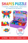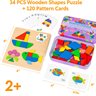 A fun and educational 34‑piece Wooden Pattern Block Puzzle Set for toddlers ages 2+. Includes 34 durable wooden shapes and 60 double‑sided pattern cards (120 designs) featuring animals, vehicles, and more. Encourages creativity, shape and color recognition, spatial skills, and problem‑solving. Made from eco‑friendly, non‑toxic materials—safe for little hands and perfect for Montessori‑style learning and play. 120 Fun Designs: Includes 34 wooden shapes and 60 double‑sided pattern cards (120 total) featuring animals, vehicles, objects, and more to spark creativity. Montessori Learning Toy: Helps toddlers develop shape and color recognition, spatial awareness, hand‑eye coordination, and early problem‑solving skills. Safe for Little Hands: Made from eco‑friendly wood with smooth edges and non‑toxic paint—durable, safe, and built to last. Endless Creative Play: Kids can follow the pattern cards or build their own imaginative designs for hours of open‑ended fun. Perfect Gift for Ages 2+: A great educational toy for toddlers and preschoolers—ideal for birthdays, holidays, or everyday learning through play.