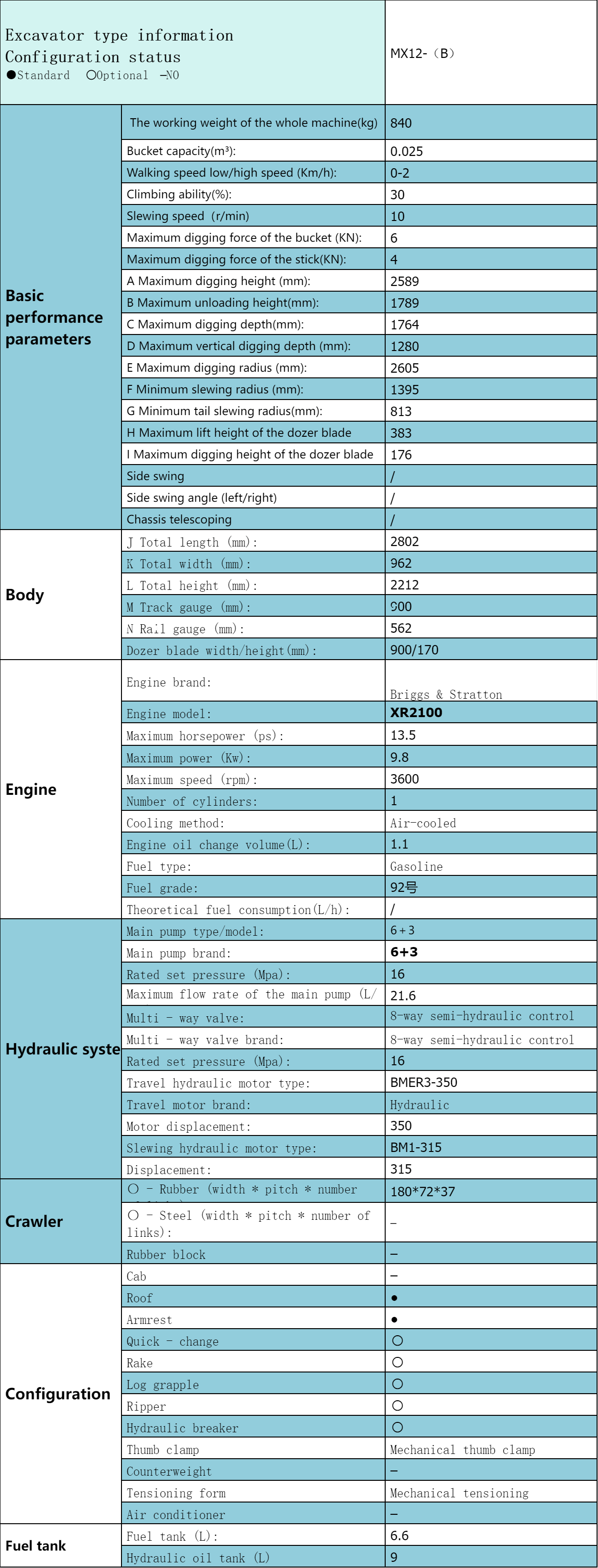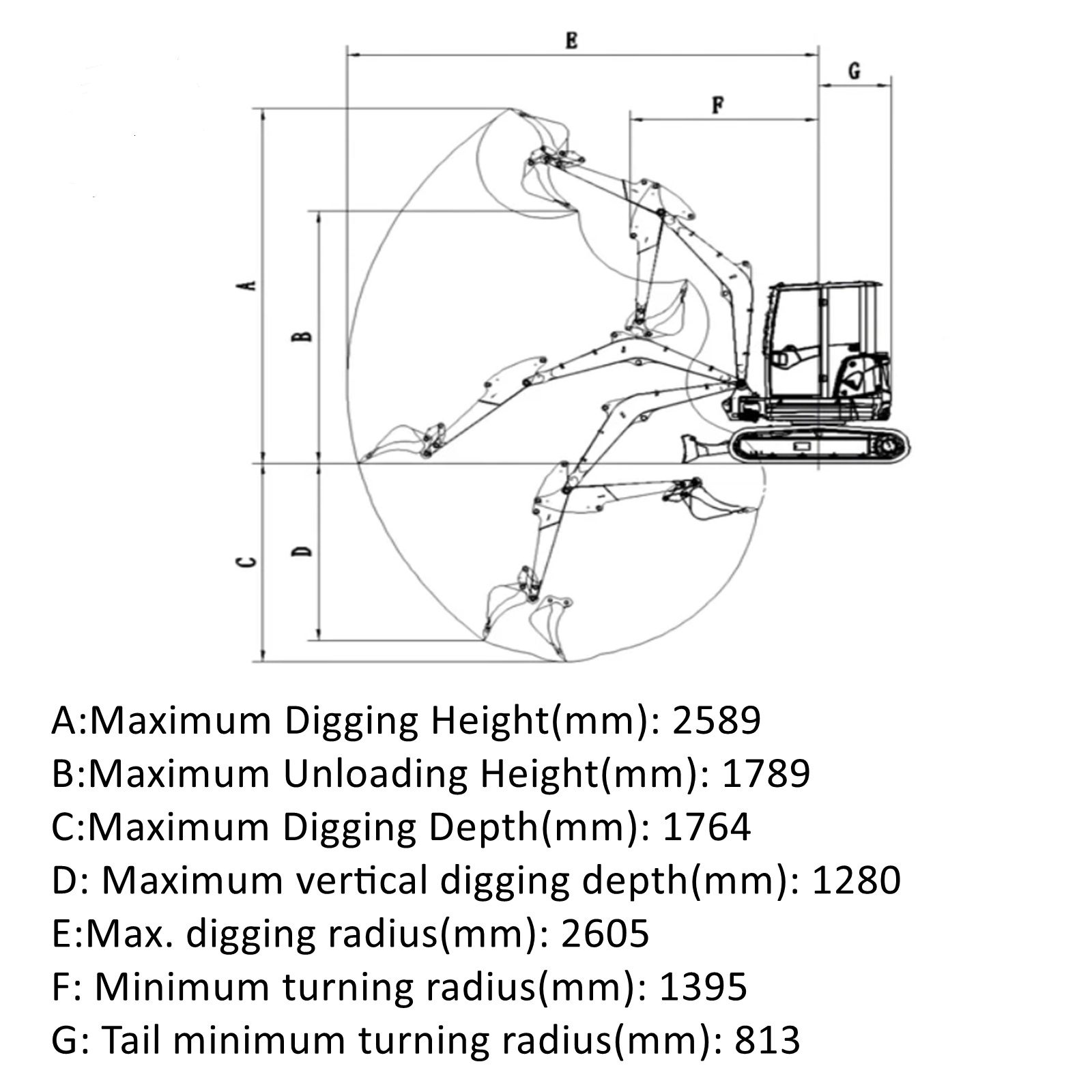 - Multi-condition adaptability: Maximum digging height of 2589mm, digging depth of 1764mm, meeting various operating requirements (such as trenching and leveling the ground).