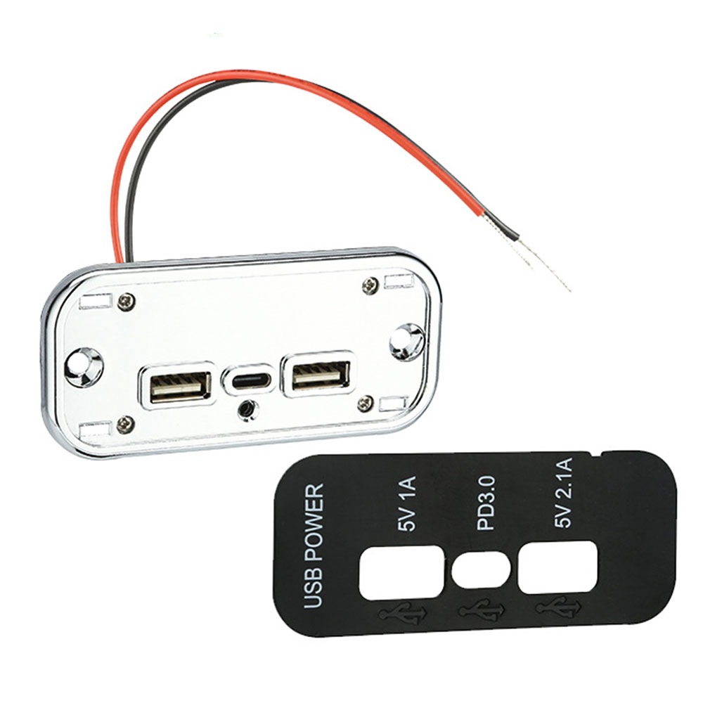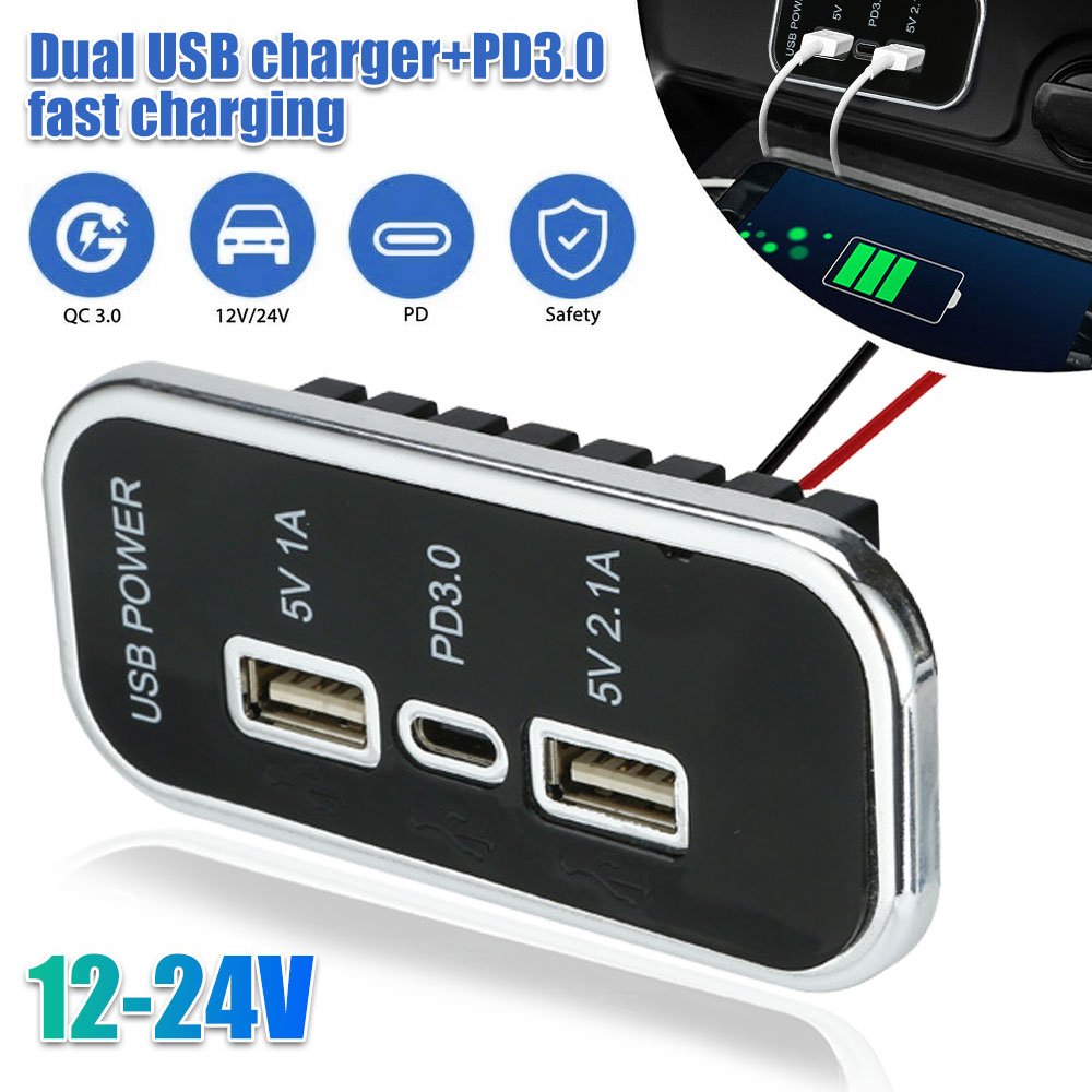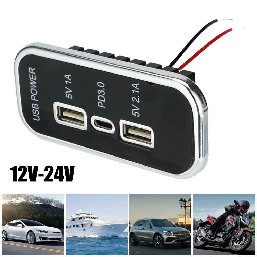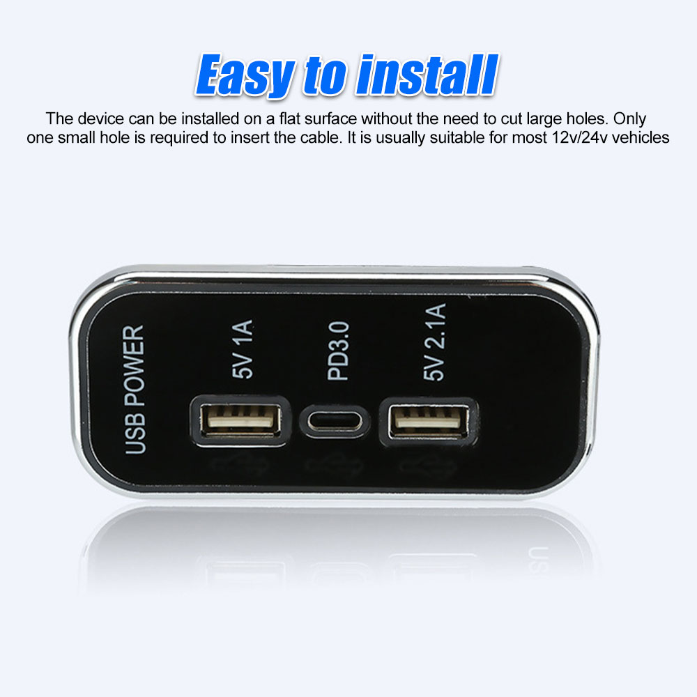 It's a surface mount. The device can be mounted on a flat surface without the need to cut large holes. It only takes a small hole to insert the cable. It can be easily installed in 20-minutes. It is typically suitable for most 12v/24v vehicles, cars, motorcycles, boats and recreational vehicles. Input: 12V connection 24V, output: 5V 4.8A. The blue indicator light always lights up when the device is switched on.