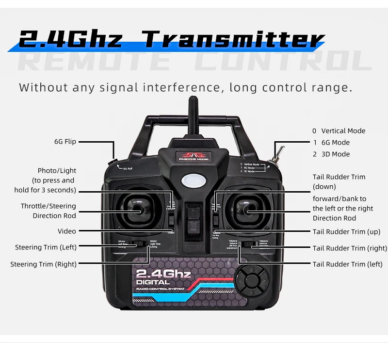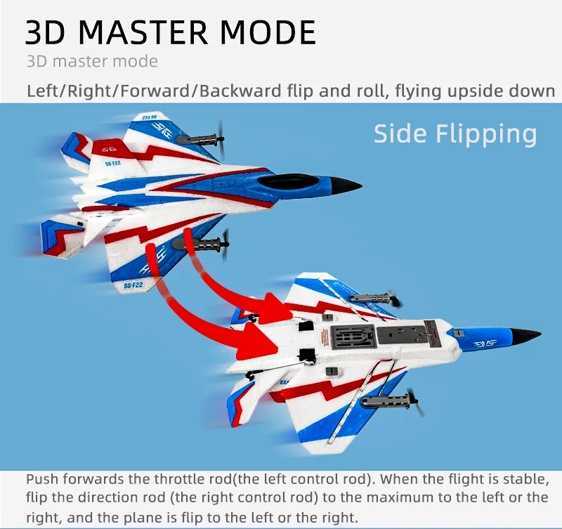 3.3D free switching mode: (rise/fall/left turn/right turn, front roll/back roll, left roll/right roll/reverse fly)