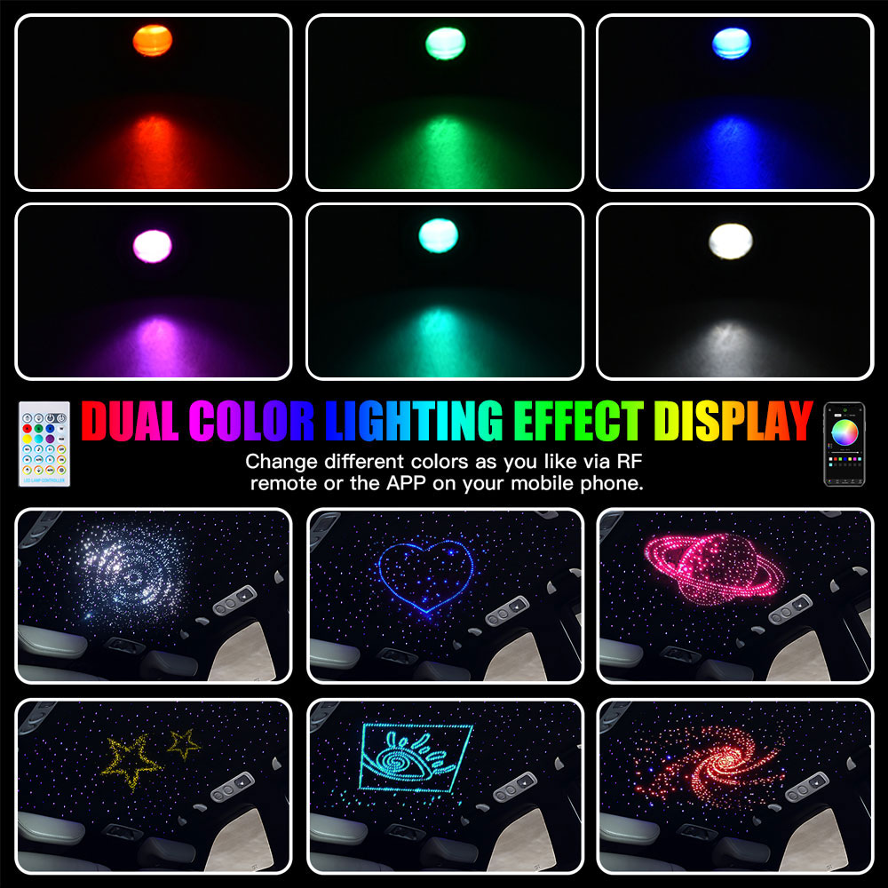 Die „aktualisierte Bluetooth-App” Glasfaserleuchte wird über das Mobiltelefon (Android bis iPhone) gesteuert. Laden Sie einfach die App herunter und schalten Sie Bluetooth ein. Sie müssen sich keine Sorgen machen, dass Sie die Fernbedienung verlieren oder beschädigen könnten. Es stehen mehrere Modi zur Auswahl. Ideal für Heimkinos, Autos, Häuser, Zimmer, Hotels, Restaurants, Unterhaltungsstätten, KTV usw.