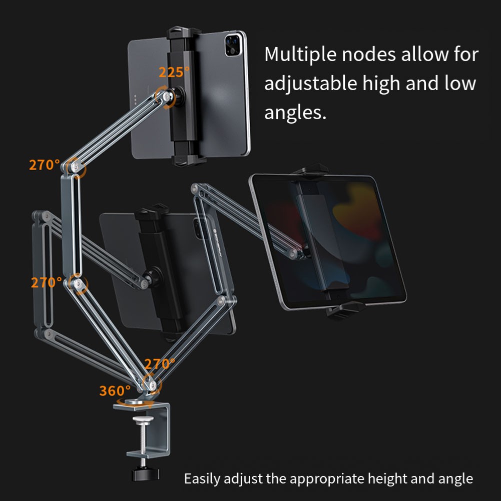 * Verstellbare Höhe und Winkel: Der Tablet-Ständer verfügt über einen Multi-Knoten-Einstellmechanismus, mit dem Sie die Höhe und den Winkel für optimalen Betrachtungskomfort leicht anpassen können, wodurch er sich perfekt für verschiedene Einstellungen wie Bett, Couch oder Büro eignet.
