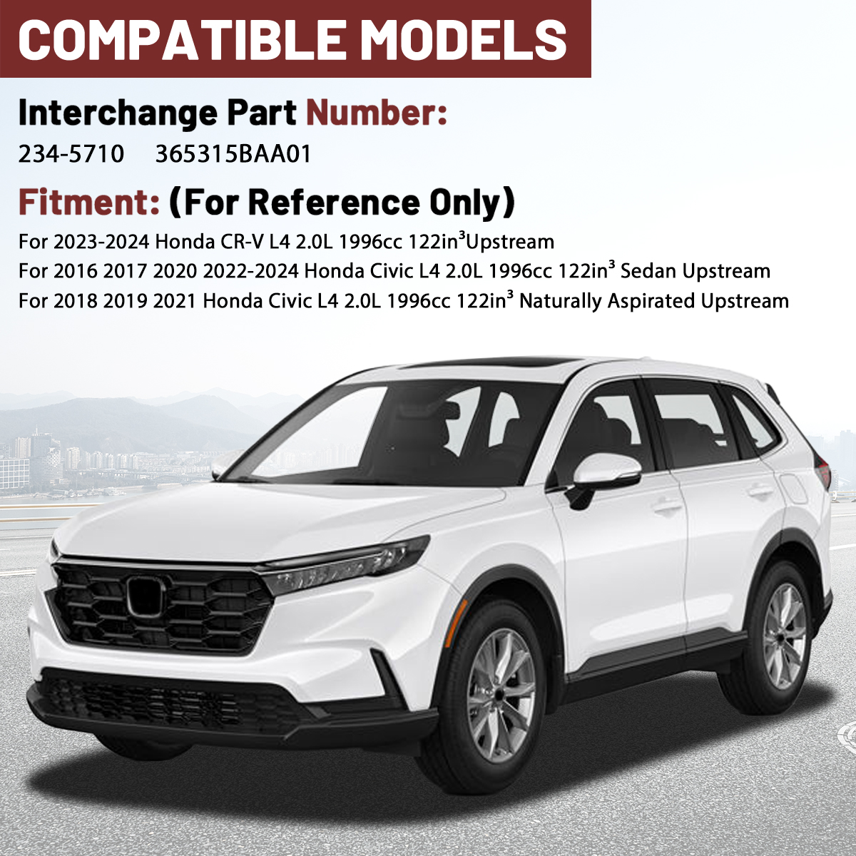 For 2023-2024 Honda CR-V L4 2.0L 1996cc 122in³Upstream For 2016 2017 2020 2022-2024 Honda Civic L4 2.0L 1996cc 122in³ Sedan Upstream For 2018 2019 2021 Honda Civic L4 2.0L 1996cc 122in³ Naturally Aspirated Upstream
