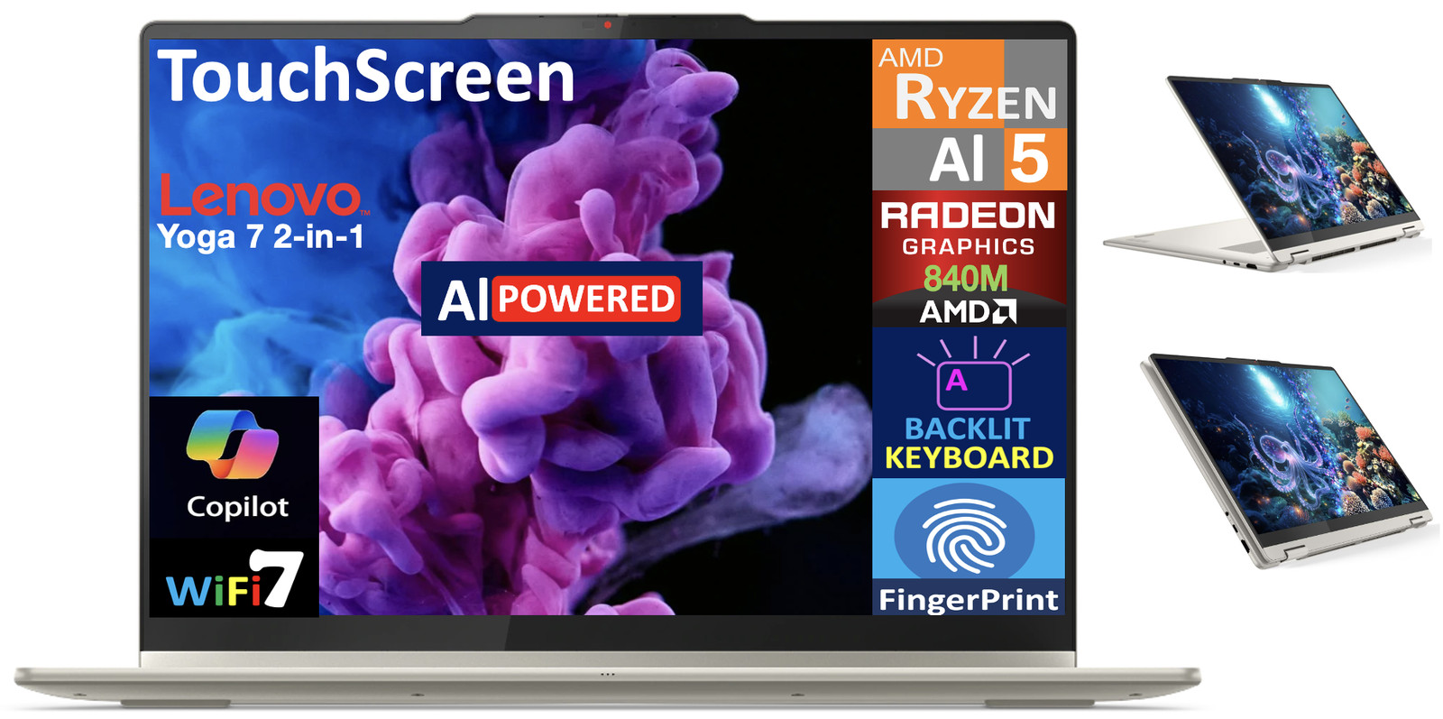 Model: Lenovo Form/Style: 2-in-1 ConvertibleProcessor: Zen 5 Gen Ryzen AI 5 340 2.00GHz Processor (upto 4.8 GHz, 16MB Cache, 6-Cores, 12-Threads, )Memory: 16GB OnBoard LPDDR5X RAMGraphics: AMD Radeon 840M Shared Integrated Graphics, Storage: 512GB PCIe SSD (Solid State Drive)Operating System: Windows 11 Home-64Display: 16.0" IPS WUXGA (1920x1200) 60Hz 16:10 Touchscreen DisplayConnectivity: 802.11be, Bluetooth 5.4, Ports/Slots:, USB 3.0 Type-A, HDMI, 2x USB 3.1 Type-C, Micro SD Reader, Headphone/Microphone Combo JackInput/Output: Webcam, Fingerprint, White, Backlit KB Standard Keyboard, Battery: 65W PSU, Type-C Power-In, USB-C Power Adapter, 4-Cell 70 WHr BatteryOther Features, Color: SeashellWeight: 4.3lbProduct Dimensions (WxLxH): 10.11 IN x 14.0 IN x 0.75 INLenovo Yoga AI PC 2-in-1 Laptop 16.0" Touchscreen IPS WUXGA Display (AMD Ryzen AI 5 340, 16GB LPDDR5X, 512GB SSD, Backlit KB, Fingerprint, WiFi 7, Webcam, Bluetooth 5.4, Win 11 Home)Model: Lenovo Form/Style: 2-in-1 ConvertibleProcessor: Zen 5 Gen Ryzen AI 5 340 2.00GHz Processor (upto 4.8 GHz, 16MB Cache, 6-Cores, 12-Threads, )Memory: 16GB OnBoard LPDDR5X RAMGraphics: AMD Radeon 840M Shared Integrated Graphics, Storage: 512GB PCIe SSD (Solid State Drive)Operating System: Windows 11 Home-64Display: 16.0" IPS WUXGA (1920x1200) 60Hz 16:10 Touchscreen DisplayConnectivity: 802.11be, Bluetooth 5.4, Ports/Slots:, USB 3.0 Type-A, HDMI, 2x USB 3.1 Type-C, Micro SD Reader, Headphone/Microphone Combo JackInput/Output: Webcam, Fingerprint, White, Backlit KB Standard Keyboard, Battery: 65W PSU, Type-C Power-In, USB-C Power Adapter, 4-Cell 70 WHr BatteryOther Features, Color: SeashellWeight: 4.3lbProduct Dimensions (WxLxH): 10.11 IN x 14.0 IN x 0.75 IN