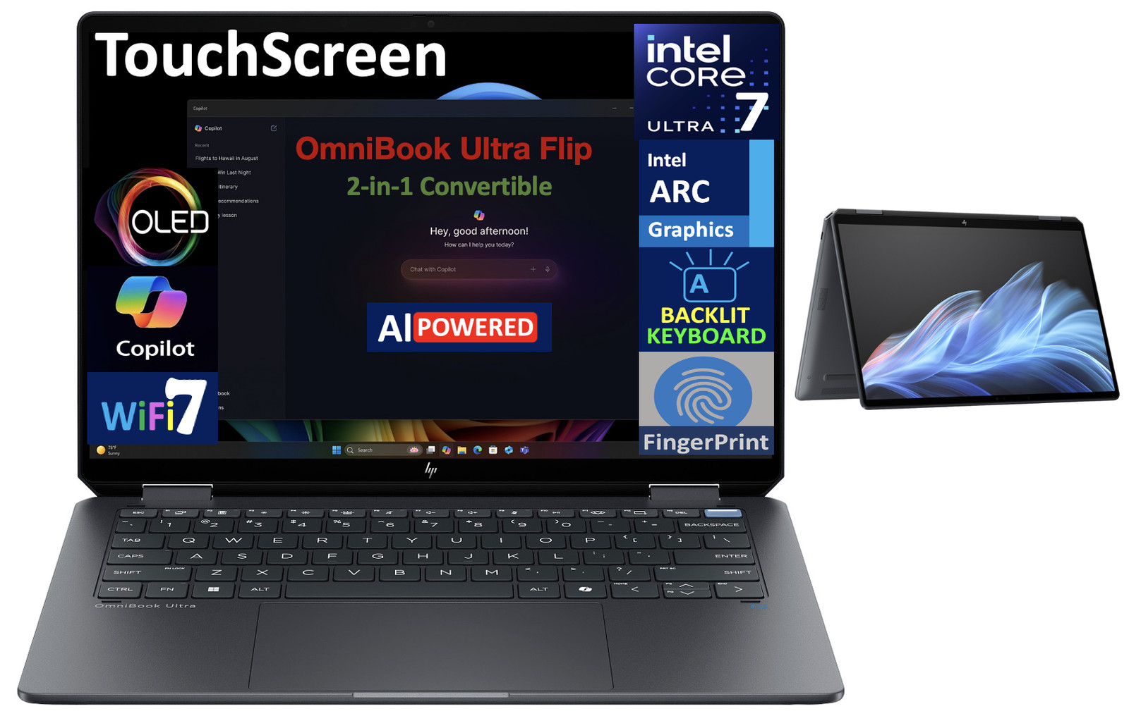 Model: HP Form/Style: 2-in-1 ConvertibleProcessor: 15th Gen Ultra 7-256V 2.20GHz Processor (upto 4.8 GHz, 12MB Cache, 8-Cores, 8-Threads, 4 Performance-cores)Memory: 16GB OnBoard LPDDR5X RAMGraphics: Intel Arc Integrated Graphics, Storage: 1TB PCIe SSD (Solid State Drive)Operating System: Windows 11 Home-64Display: 14.0" OLED 2.8K (2880x1800) 120Hz 16:10 Touchscreen DisplayConnectivity: 802.11be, Bluetooth 5.4, Ports/Slots:, 2 Thunderbolt 4, USB 3.2 Type-C, Headphone/Microphone Combo JackInput/Output: Webcam, Fingerprint, Grey, Backlit KB Standard Keyboard, Battery: 65W PSU, Type-C Power-In, 4-Cell 64 WHr BatteryOther Features, Color: Eclipse GrayWeight: 2.9lbProduct Dimensions (WxLxH): 8.5 IN x 12.4 IN x 0.75 INHP OmniBook Ultra Flip AI Powered 2-in-1 Laptop 14.0" Touchscreen OLED 2.8K Display (Intel Ultra 7-256V, 16GB LPDDR5X, 1TB SSD, Backlit KB, Fingerprint, 2 Thunderbolt 4, WiFi 7, Webcam, Win 11 Home)Model: HP Form/Style: 2-in-1 ConvertibleProcessor: 15th Gen Ultra 7-256V 2.20GHz Processor (upto 4.8 GHz, 12MB Cache, 8-Cores, 8-Threads, 4 Performance-cores)Memory: 16GB OnBoard LPDDR5X RAMGraphics: Intel Arc Integrated Graphics, Storage: 1TB PCIe SSD (Solid State Drive)Operating System: Windows 11 Home-64Display: 14.0" OLED 2.8K (2880x1800) 120Hz 16:10 Touchscreen DisplayConnectivity: 802.11be, Bluetooth 5.4, Ports/Slots:, 2 Thunderbolt 4, USB 3.2 Type-C, Headphone/Microphone Combo JackInput/Output: Webcam, Fingerprint, Grey, Backlit KB Standard Keyboard, Battery: 65W PSU, Type-C Power-In, 4-Cell 64 WHr BatteryOther Features, Color: Eclipse GrayWeight: 2.9lbProduct Dimensions (WxLxH): 8.5 IN x 12.4 IN x 0.75 IN