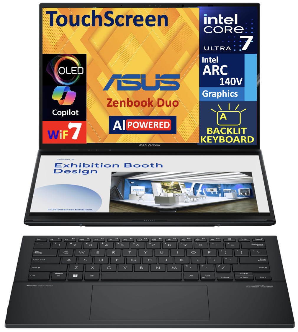 Model: ASUS Form/Style: Dual ScreenModel No: UX8406CA-DS79TProcessor: Ultra 7-255H 2.00GHz Processor (upto 5.1 GHz, 24MB Cache, 16-Cores, 16-Threads, 6 Performance-cores)Memory: 32GB OnBoard LPDDR5X RAMGraphics: Intel Arc 140V Shared Integrated Graphics, Storage: 1TB PCIe SSD (Solid State Drive)Operating System: Windows 11 Home-64Display: 14.0" OLED 2.8K (2880x1800) 120Hz 16:10 Touchscreen DisplayConnectivity: 802.11be, Bluetooth 5.4, Ports/Slots:, HDMI, 2 Thunderbolt 4, Headphone/Microphone Combo JackInput/Output: Webcam, Grey, Backlit KB Wireless Keyboard, Battery: 65W PSU, Type-C Power-In, 4-Cell 75 WHr BatteryOther Features, Color: Inkwell GrayWeight: 3.8lbProduct Dimensions (WxLxH): 8.6 IN x 12.38 IN x 0.88 INASUS Zenbook Duo AI Powered 2-in-1 Laptop 14.0" Touchscreen OLED 2.8K Display (Intel Ultra 7-255H, 32GB LPDDR5X, 1TB SSD, Backlit KB, 2 Thunderbolt 4, WiFi 7, Webcam, Bluetooth 5.4, Win 11 Home)Model: ASUS Form/Style: Dual ScreenModel No: UX8406CA-DS79TProcessor: Ultra 7-255H 2.00GHz Processor (upto 5.1 GHz, 24MB Cache, 16-Cores, 16-Threads, 6 Performance-cores)Memory: 32GB OnBoard LPDDR5X RAMGraphics: Intel Arc 140V Shared Integrated Graphics, Storage: 1TB PCIe SSD (Solid State Drive)Operating System: Windows 11 Home-64Display: 14.0" OLED 2.8K (2880x1800) 120Hz 16:10 Touchscreen DisplayConnectivity: 802.11be, Bluetooth 5.4, Ports/Slots:, HDMI, 2 Thunderbolt 4, Headphone/Microphone Combo JackInput/Output: Webcam, Grey, Backlit KB Wireless Keyboard, Battery: 65W PSU, Type-C Power-In, 4-Cell 75 WHr BatteryOther Features, Color: Inkwell GrayWeight: 3.8lbProduct Dimensions (WxLxH): 8.6 IN x 12.38 IN x 0.88 IN