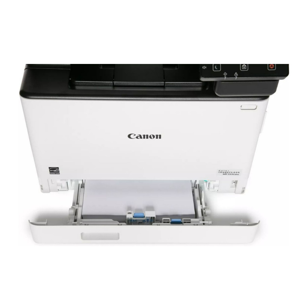 The Canon imageCLASS MF753Cdw Wireless Duplex Laser Printer in White has print, scan, copy, and fax capabilities and can print up to 35 pages per minute. It comes with an easy Wi-Fi setup. To connect, press wireless LAN, select network, enter encryption key or password, and finalize. The MF753Cdw uses Canon Genuine Toner 069 and 069 H. With 069, black prints up to 2100 sheets and color prints up to 1900 sheets. With 069 H, black prints up to 7600 sheets and color prints up to 5500 sheets. The high-capacity toner option keeps up with your printing needs and limits toner replacement interruptions. Standard paper capacity provides up to 250 sheets in the cassette and 50 sheets in the multipurpose tray. Optional cassette PF-K1 provides up to 550 sheets, giving you up to 850 sheets of paper capacity.