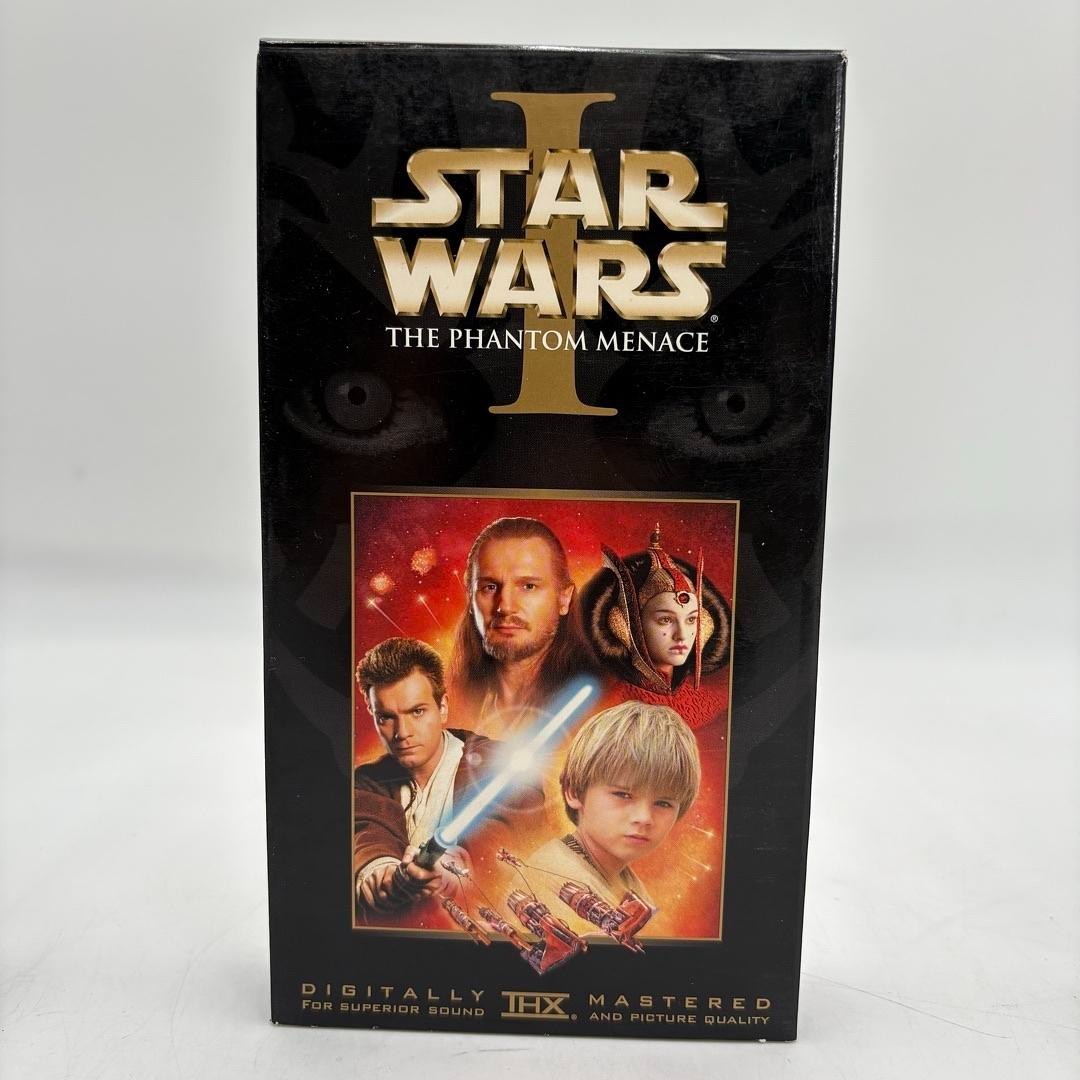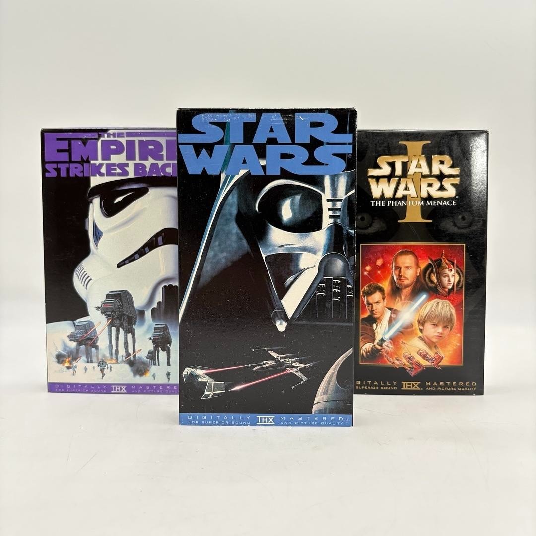 These Star Wars VHS tapes feature three iconic movies from the sci-fi and fantasy franchise: The Empire Strikes Back, A New Hope, and The Phantom Menace.