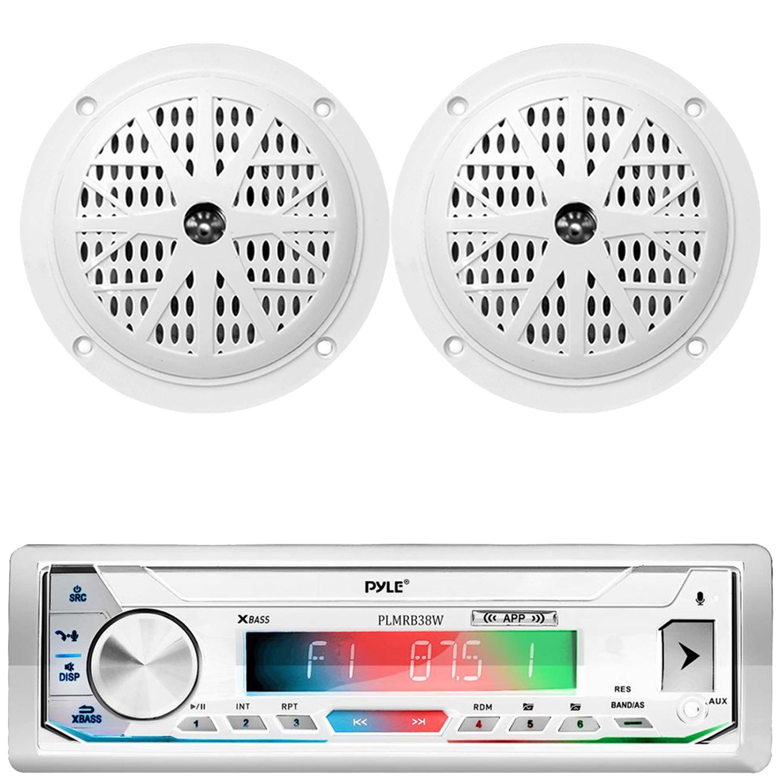 Pyle PLMRB39W LCD Display Single-DIN Marine Bluetooth USB/AUX MP3 Player AM/FM Radio Stereo White Receiver, 2x Pyle PLMR41W 4'' 100 Watt Max Power Dual Cone Waterproof White Stereo Speakers