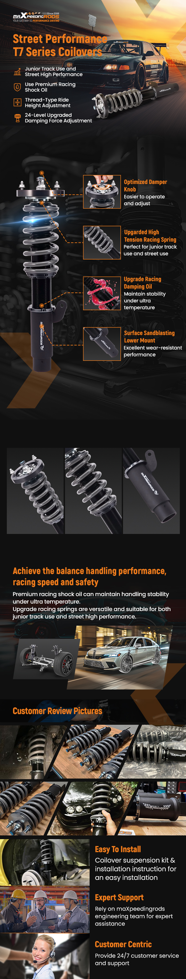 maXpeedingrods SP2 Gewindefahrwerke sind for den täglichen Einsatz auf der Straße und den gelegentlichen Einsatz auf der Rennstrecke konzipiert. Es verfügt über Racing-Dämpfungsöl, eine verbesserte Racing-Feder, eine über die gesamte Länge höhenverstellbare und einstellbare Sturzplatte (gilt for einige Fahrzeuge), die Ihnen eine niedrigere Haltung und ein verbessertes Handling bietet.