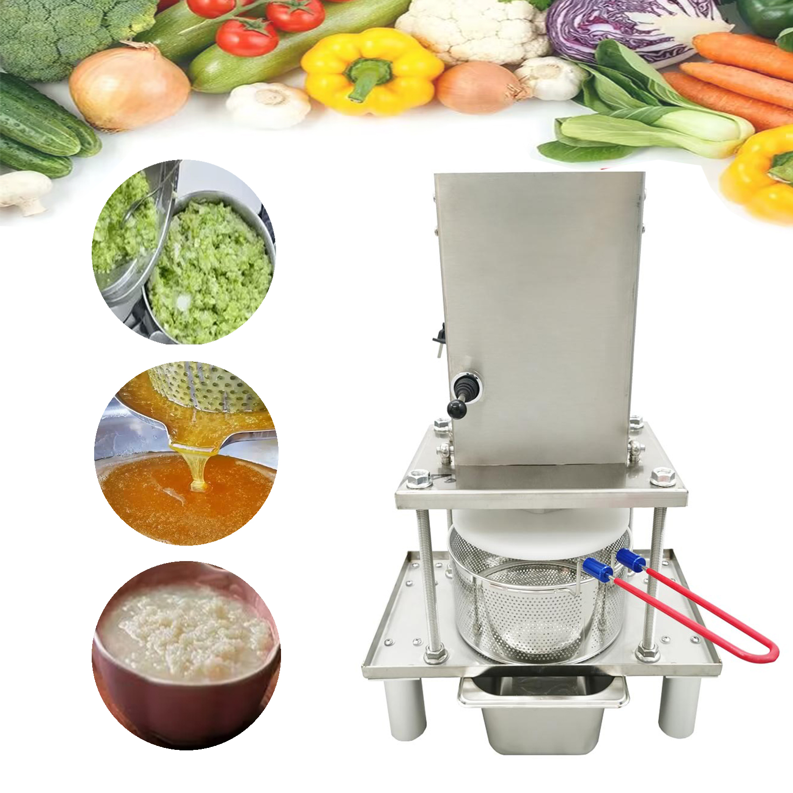 - Thickened stainless steel press shaft, the pressure force is large, so that the material can be fully squeezed. - Food grade resin platen to ensure health and cleanliness. - Wide range of application, can be used for vegetable stuffing squeezing, fruit juice squeezing, oil squeezing, wine tank squeezing, honey squeezing, Chinese medicine juice, etc., a multi-purpose machine. - Stainless steel mesh squeeze basin can be used for cooking noodles, frying, shabu-shabu, to meet a variety of purposes. |