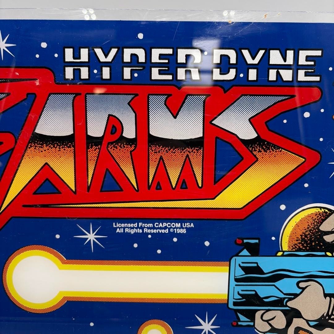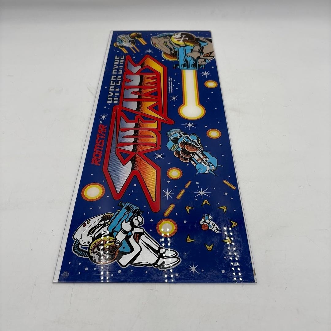 The product is a vintage arcade marquee header made of plexiglass, measuring 24.5 x 9.5 inches, featuring the game title "SIDE ARMS" by the brand Romstar from 1986.