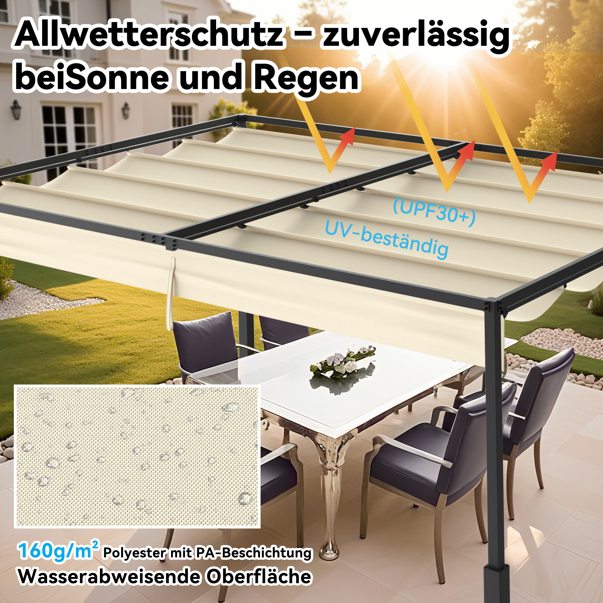 đăFlexibles SonnenschutzâăMit der Pergola mit Schiebedach bestimmen Sie selbst, wie viel Sonne oder Schatten Sie genießen möchten. Das verschiebbare Dach lässt sich stufenlos öffnen oder schließen – ideal, um sich vor starker Sonne zu schützen oder warmes Licht hereinzulassen. So schaffen Sie jederzeit ein angenehmes Klima – ob beim Entspannen, Essen oder Feiern im Freien.đď¸ăAllwettertauglichkeitâăOb heiße Sommertage, plötzlicher Regen oder stürmischer Wind – dieser Pavillon wasserdicht stabil Winterfest ist für jedes Wetter gerüstet. Die stabile Metallkonstruktion und das wasserabweisende Dachmaterial bieten ganzjährigen Schutz für Sie, Ihre Gäste und Ihre Gartenmöbel. Für maximale Sicherheit und langlebige Nutzung bei jeder Saison.