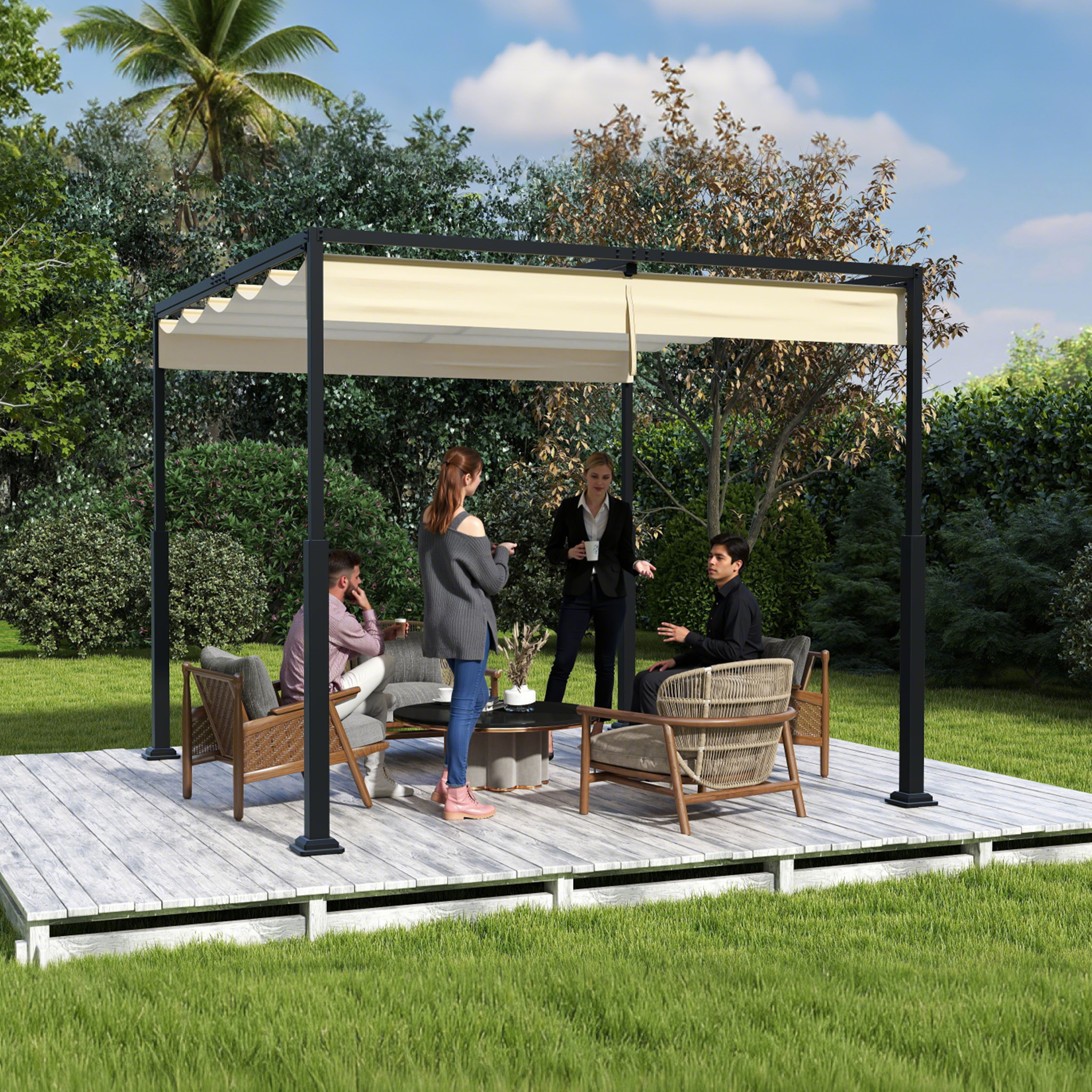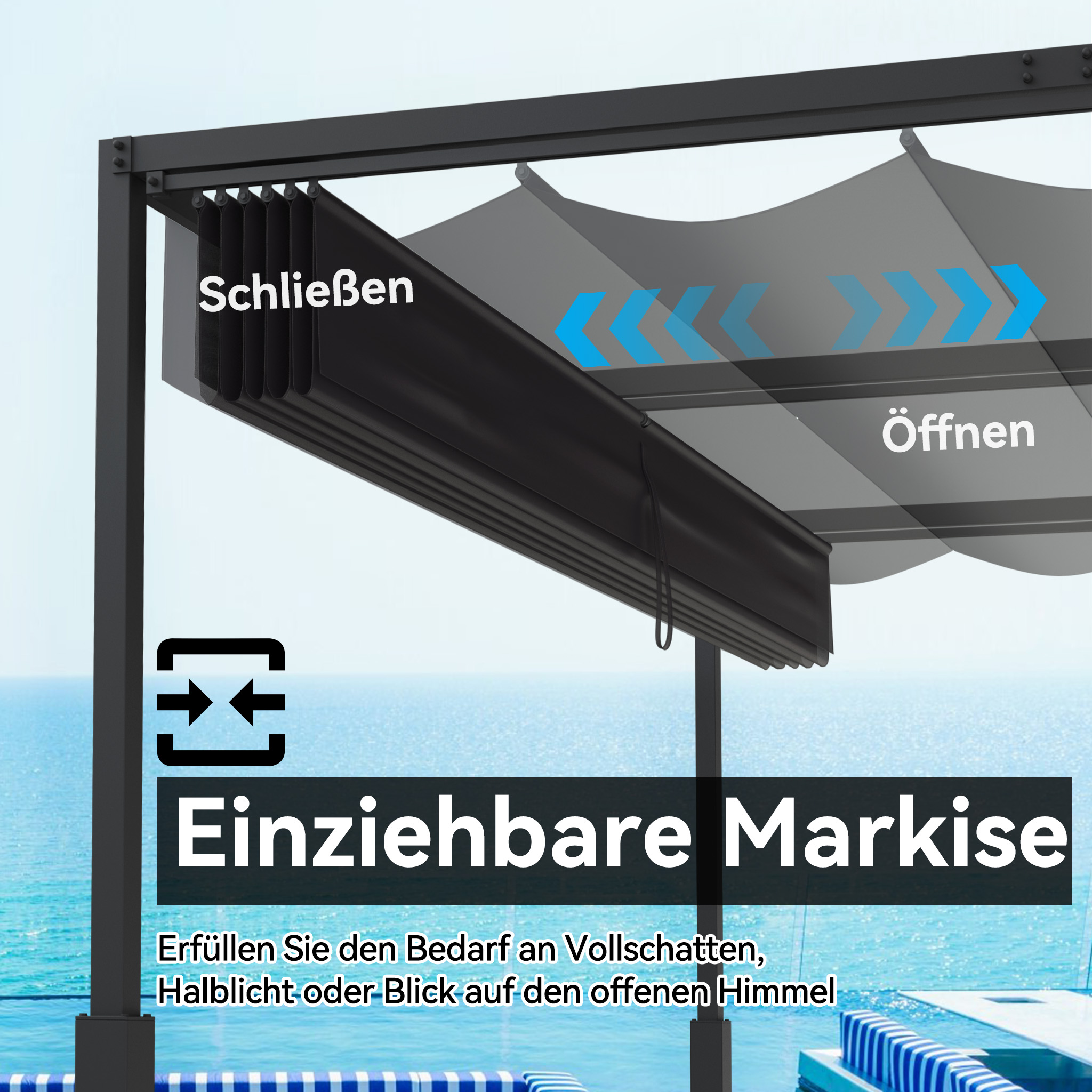 đ§ăEinfache MontageâăDie Pergola mit Schiebedach lässt sich dank cleverer Konstruktion schnell und unkompliziert montieren – auch ohne handwerkliche Vorkenntnisse. Alle benötigten Materialien sind bereits im Lieferumfang enthalten. Das stabile, pflegeleichte Design sorgt für langanhaltenden Komfort und minimalen Wartungsaufwand – damit Sie viele Jahre entspannt Ihren Garten genießen können.