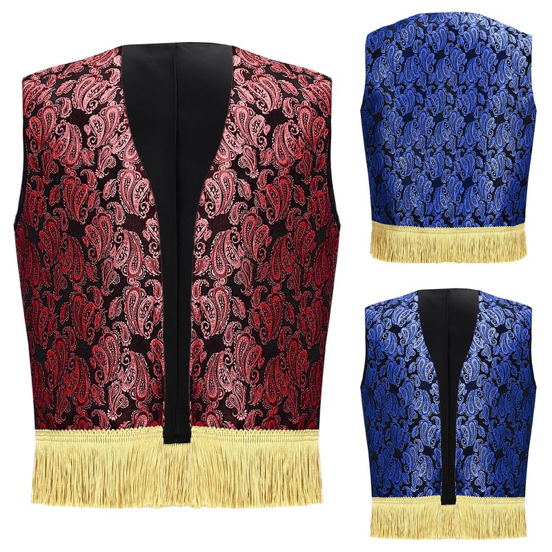 A game character cosplay vest for child size, gold trim around neck and front, open front design without button.