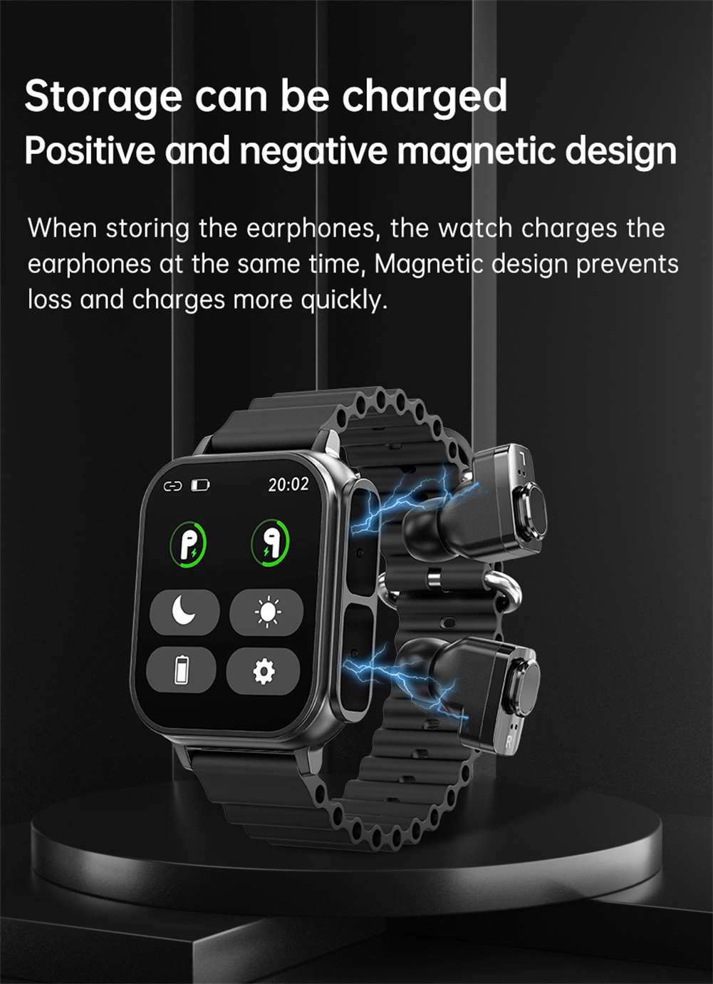 1、2 in 1 Smart Watch: 2 in 1 smart watch and TWS Bluetooth 5.0 headset, one device, two functions, Bluetooth connection, one-touch pairing with music devices, a new experience for smart wearable devices.