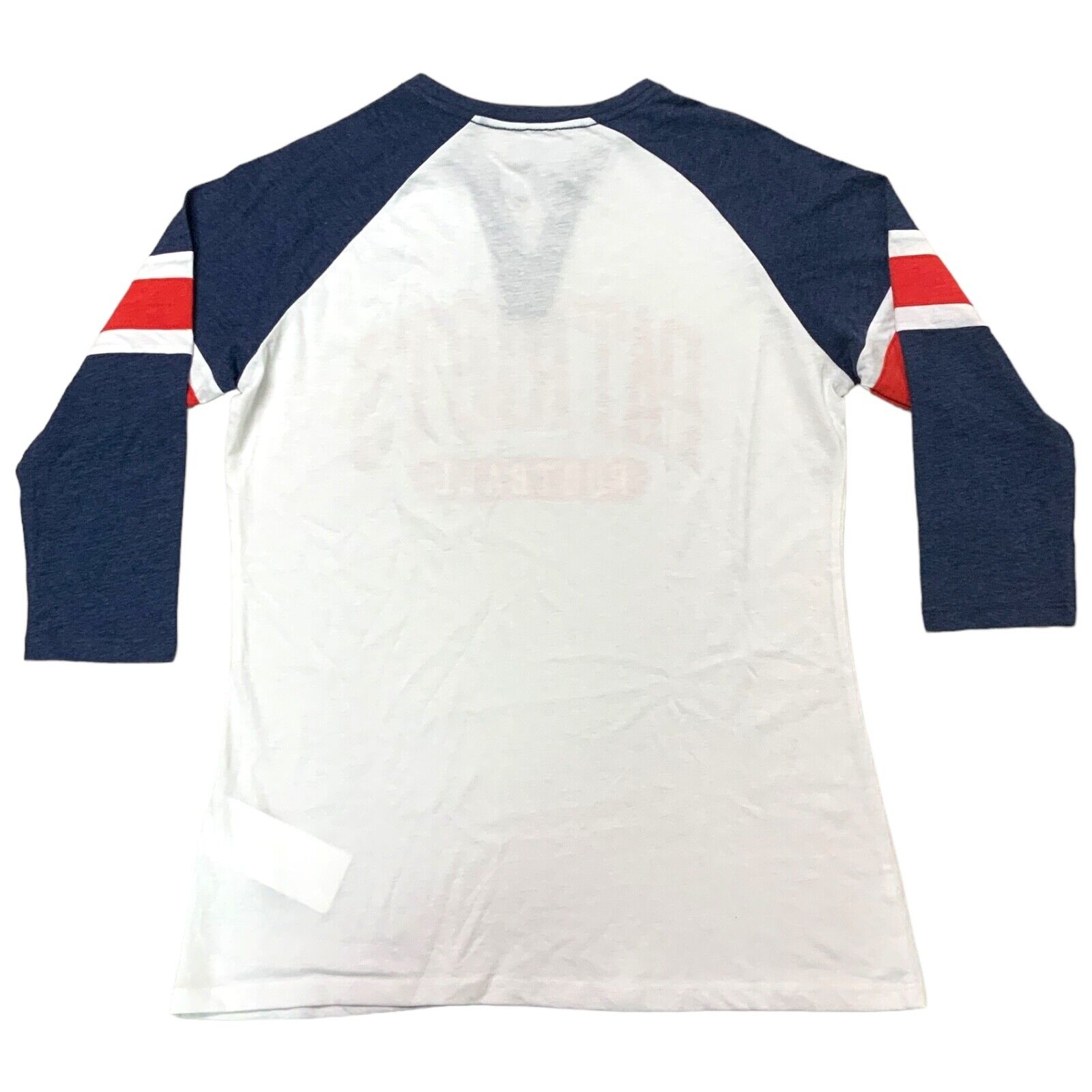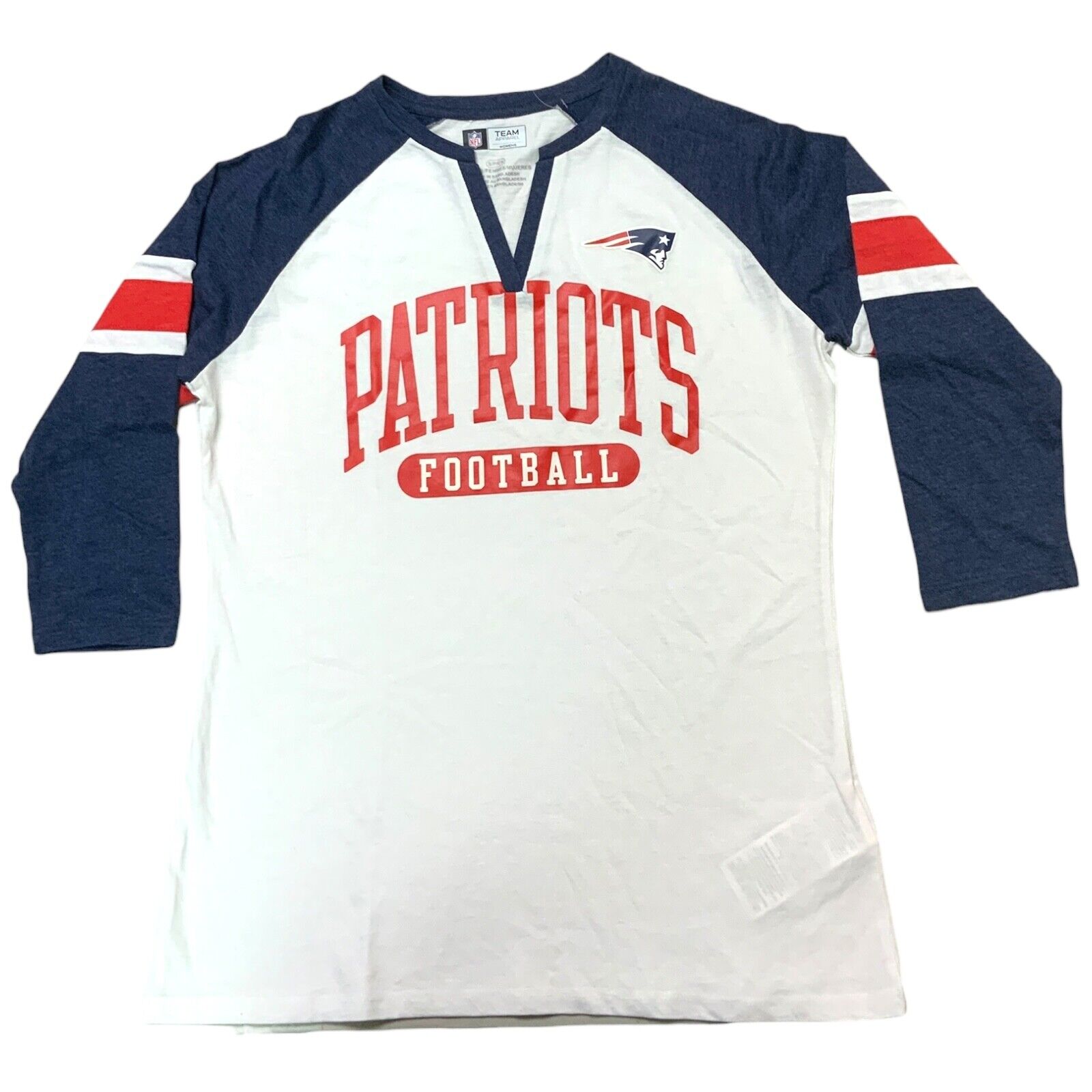 This officially licensed New England Patriots top features a Patriots graphic print on the front in team colors. The 3/4 raglan sleeves with stripes give this tee a sporty look. This classic fit shirt with a v-neckline comes in a lightweight blended fabric made out of 60% cotton and 40% polyester. This is a women's size large. Measurements: 27" length, 21" chest, 22.5" raglan sleeve length.