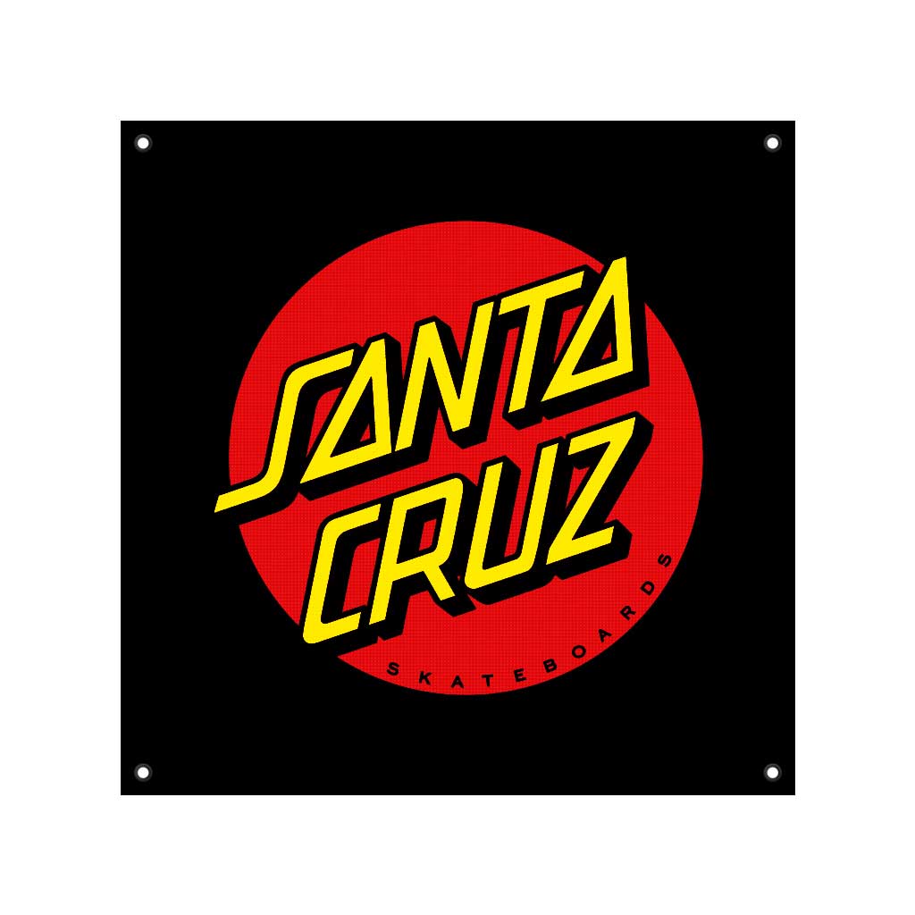 This is a high quality vinyl banner from Santa Cruz skateboards. Featuring the iconic logo on a black background and measuring 36” x 36”. Constructed with durable vinyl and metal eyelets for hanging. Bring the look and feel of the shop or park to your very own board room!