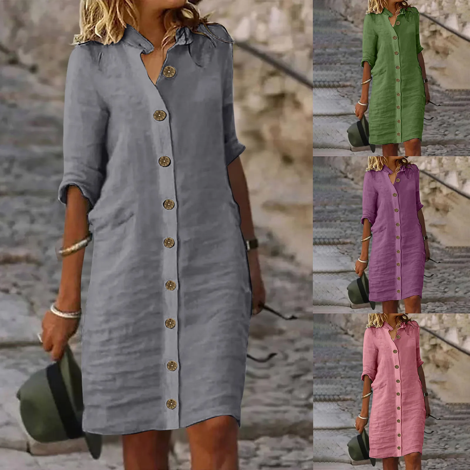 Features: Summer Casual Cotton Shirt Dress, Spring Button Up Midi Dress, 1/2 Long Sleeve Beach Dress, Lapel V Neck T-Shirt Dress, Solid Color and A-Line Design, Loose Casual Beach Dress. You will love it.