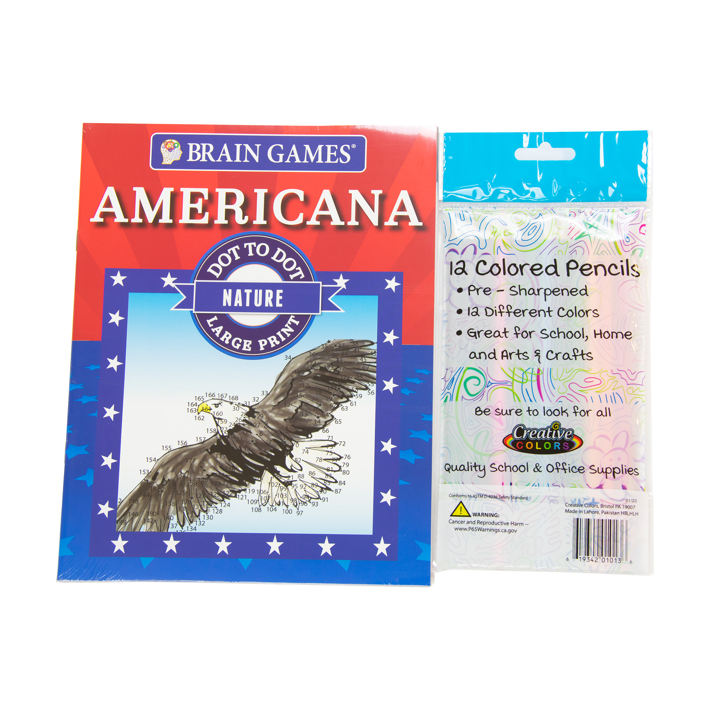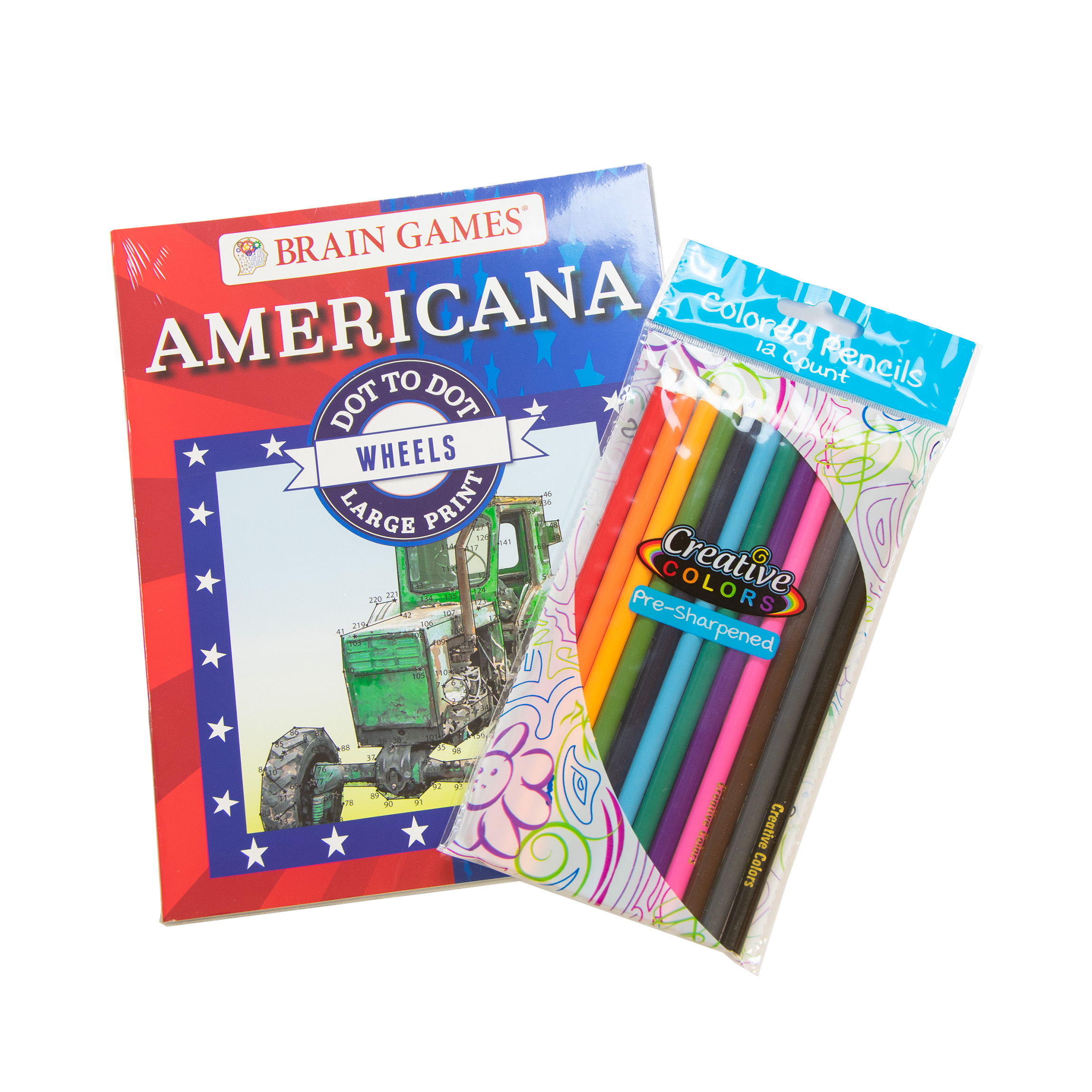 Brain Games: Large Print Americana Dot-to-Dot books feature 25 distinct puzzles that will challenge your brain and help you relax. Pull one out when you're on a break, on the bus, or simply ready for a recharge. Start on the first dot and work consecutively until you unveil vivid American images. This set includes 5 books and one 12 pack of colored pencils. Book dimensions: 9" L x 7" W.