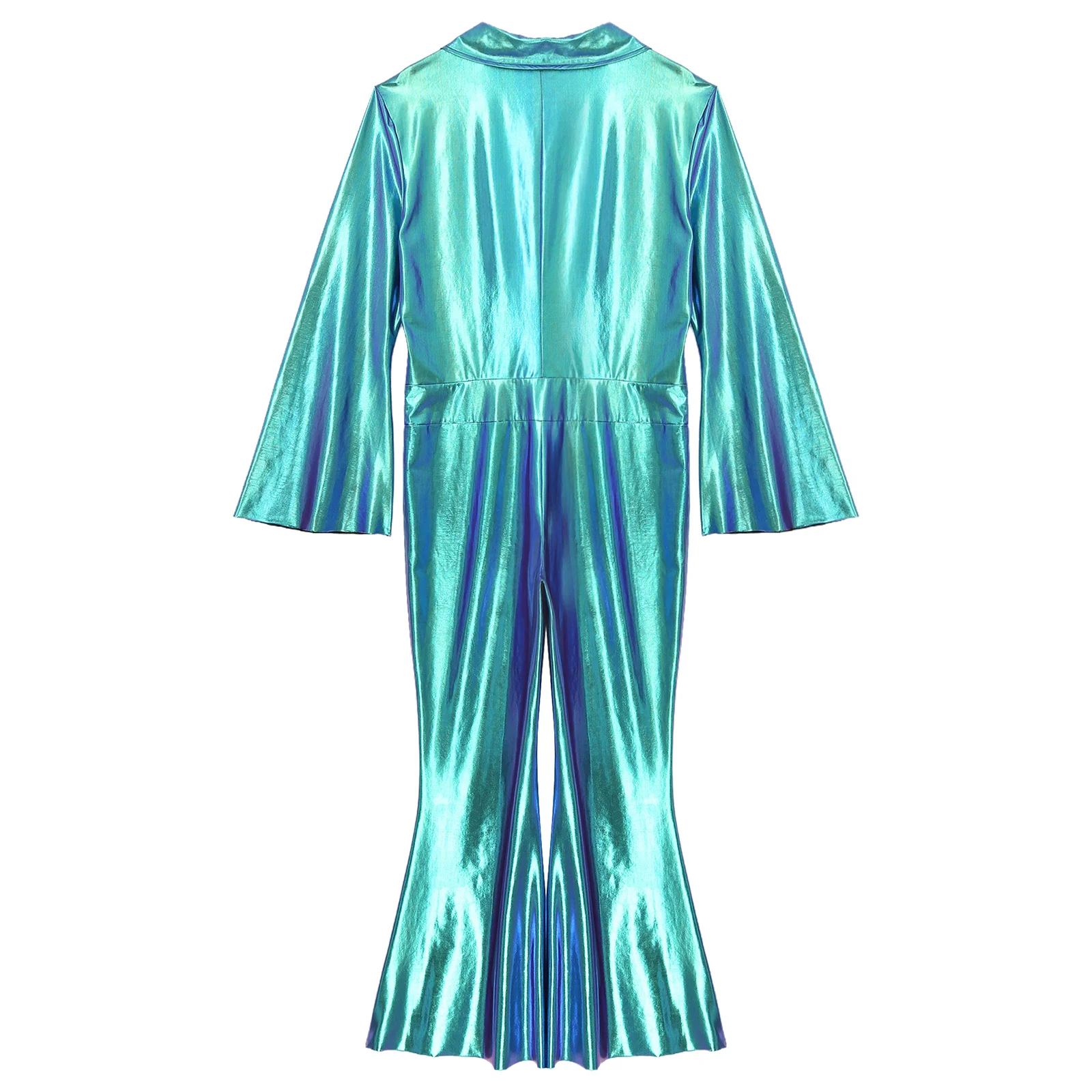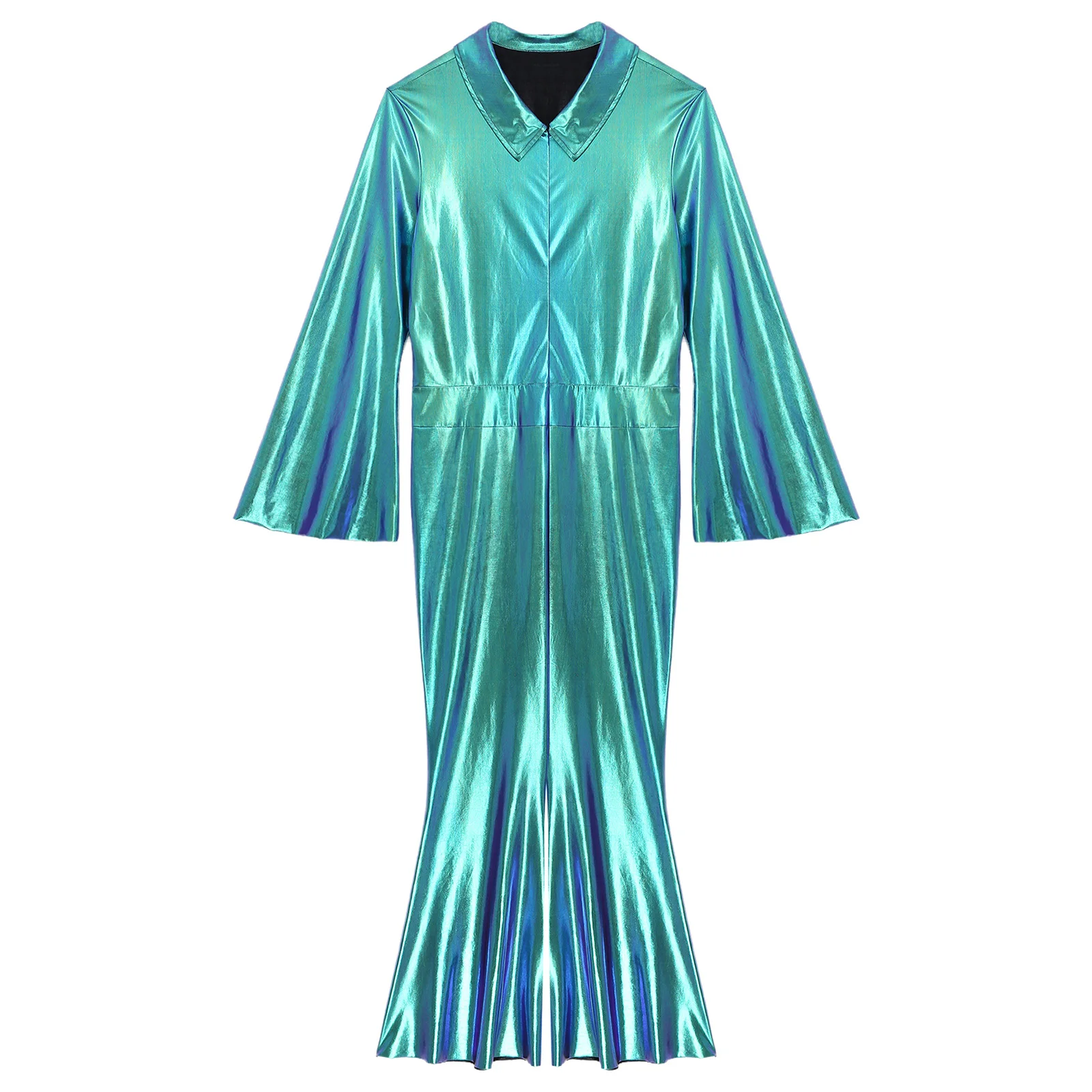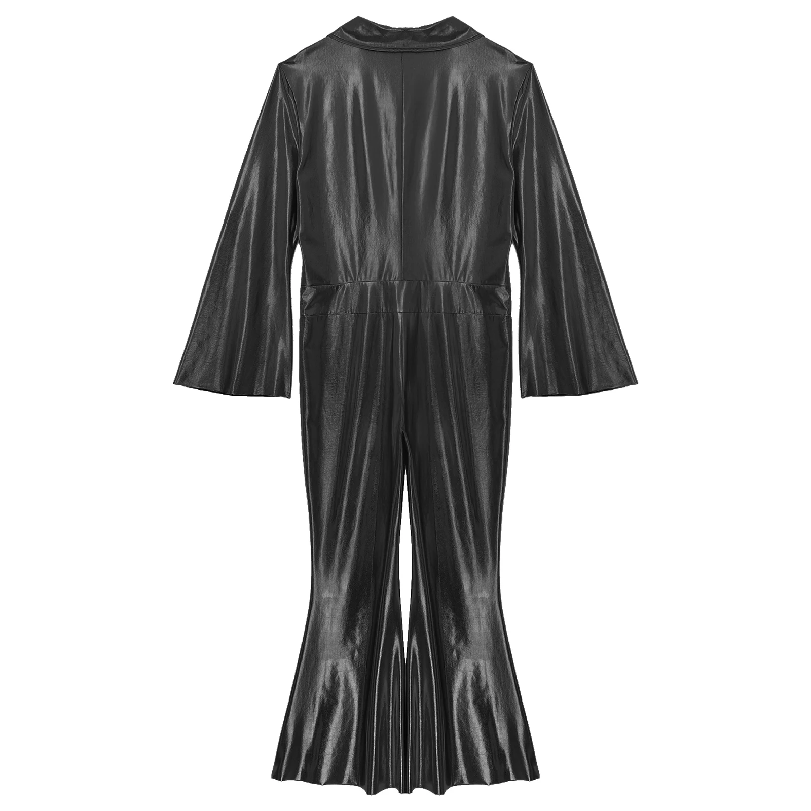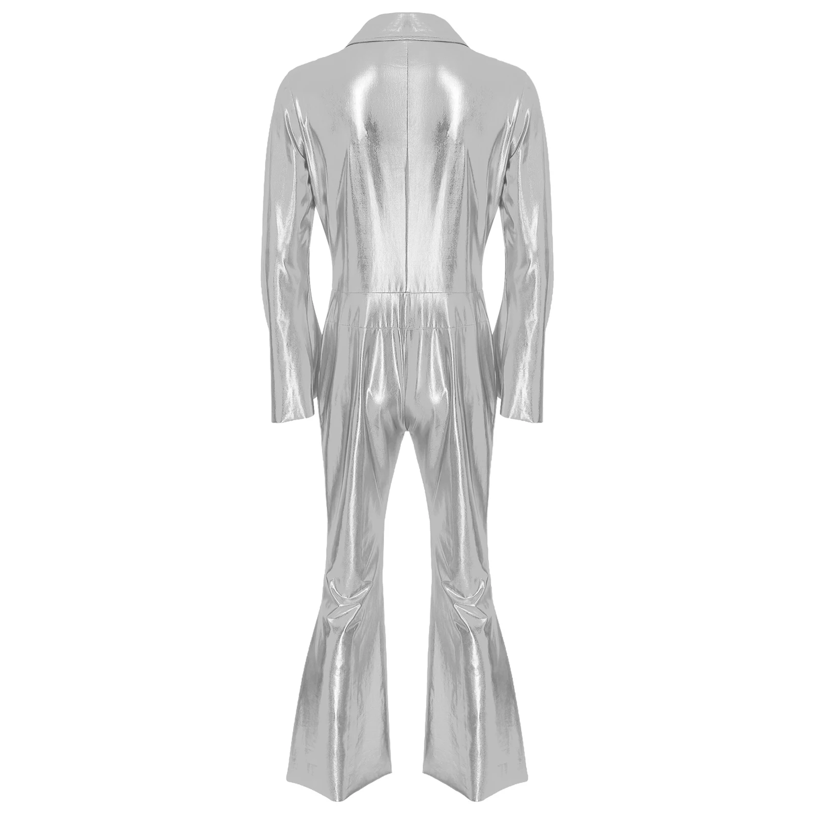 One-piece jumpsuit is designed with lapel, flared long sleeve, front zipper, wide leg pants bottom and comfortable fitting, perfect for men.