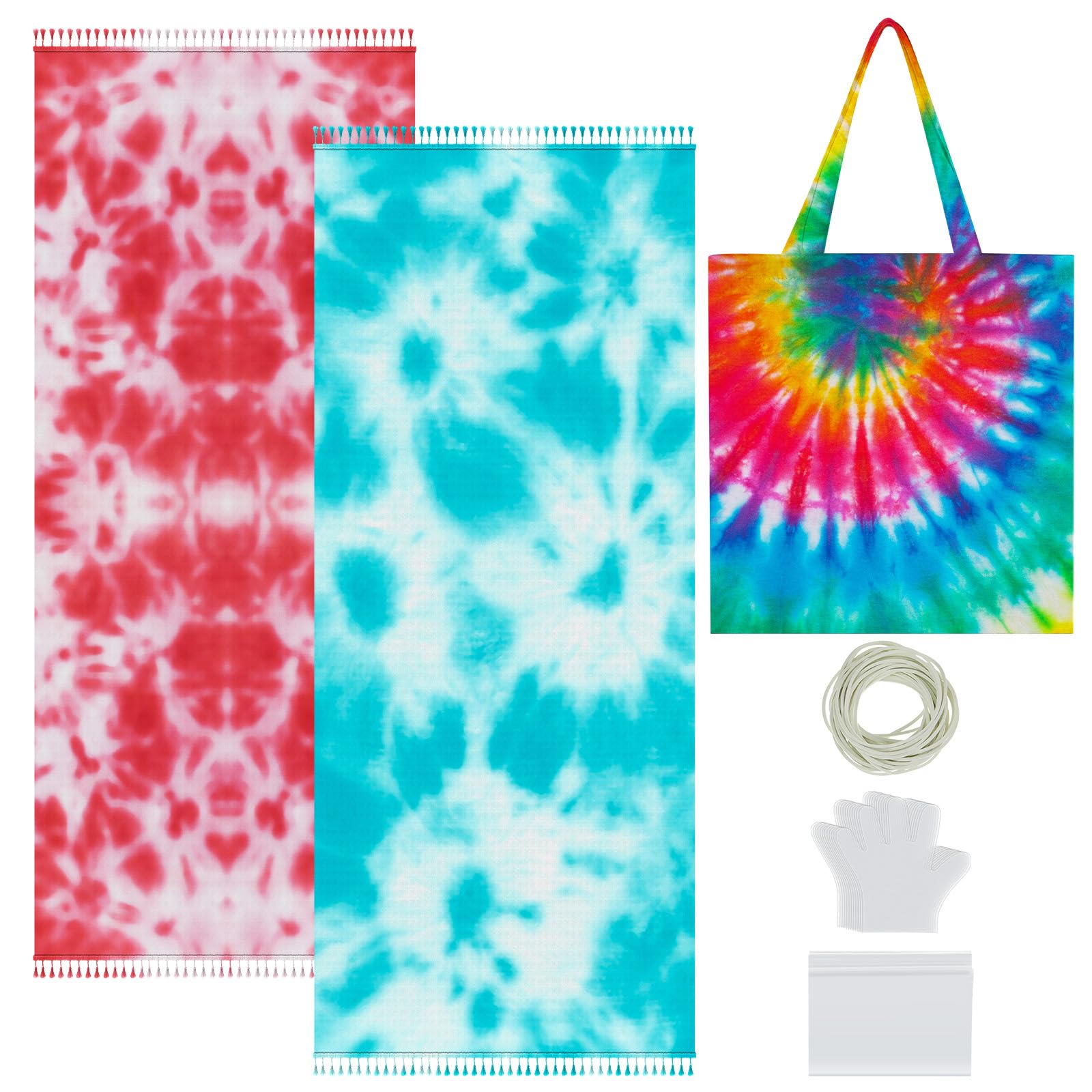 Features: Bulk for Tie-Dye Parties: With 2 large towels, 2 canvas bags, this stuff for tie dye is suitable for team or groups, summer camps, or DIY parties, create matching sets with friends! Multi-Surface: Dye the beach towels as wall hangings, transform the canvas bags into unique totes, versatile items to tie dye. Specifications: Material: cotton Color: white Size: Beach towels: 71 x 43.3 Inches / 180 x 110 cm Tote bags: 12 x 14 inches / 30.5 x 35.5 cm Package includes: 2 x Beach towels 2 x Tote bags 20 x Rubber bands 4 Pairs gloves 4 x Bags Notes: Manual measurement, please allow slight errors on size. The color may exist a slight difference due to different screen displays.