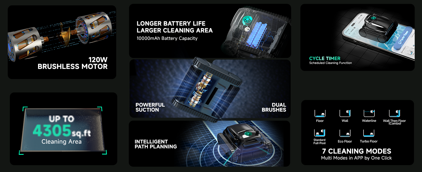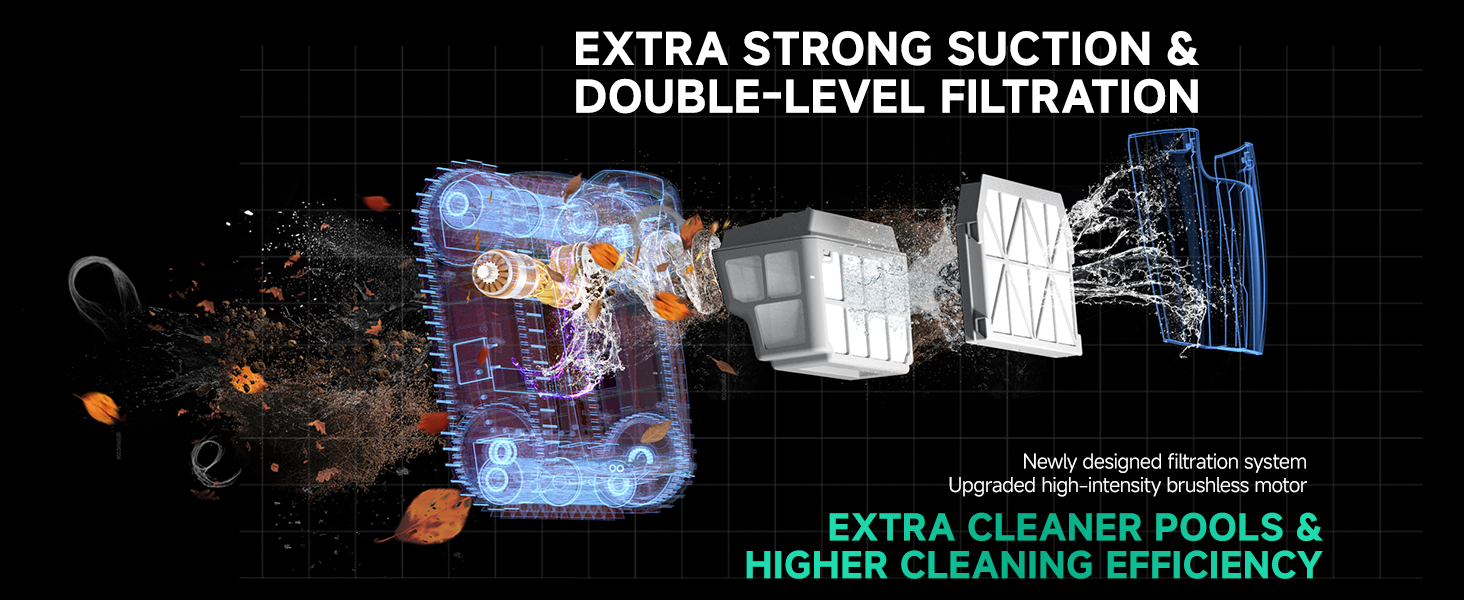 Powerful Suction: Equipped with 120W Brushless Motor, commercial-grade power, it effectively captures debris, dirt, and leaves from the pool floor and walls.