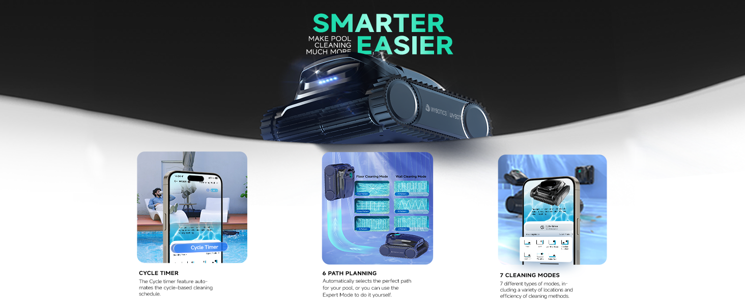 7 Cleaning Modes & 6 Paths: Features 7 specialized cleaning modes and 6 efficient cleaning paths to thoroughly clean walls, floors, waterlines, and more for a spotless pool. Cleaning modes can be adjusted via touchscreen buttons on the robot.