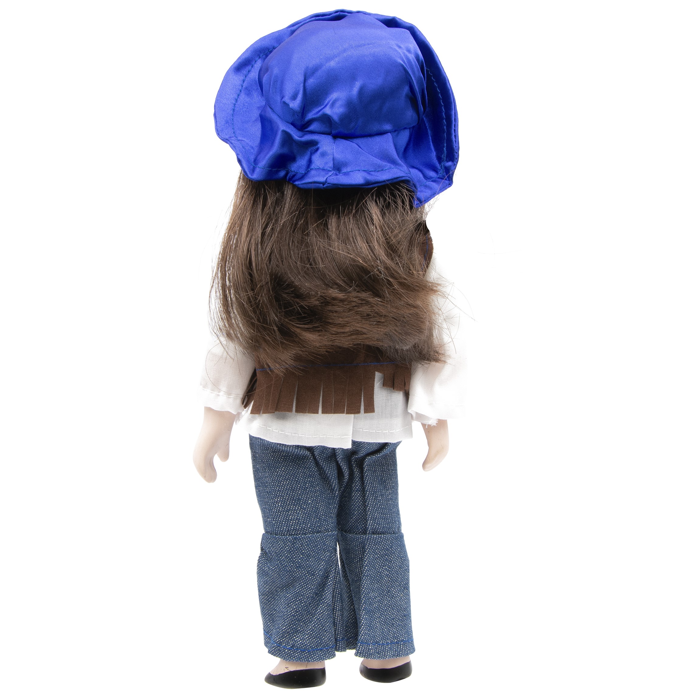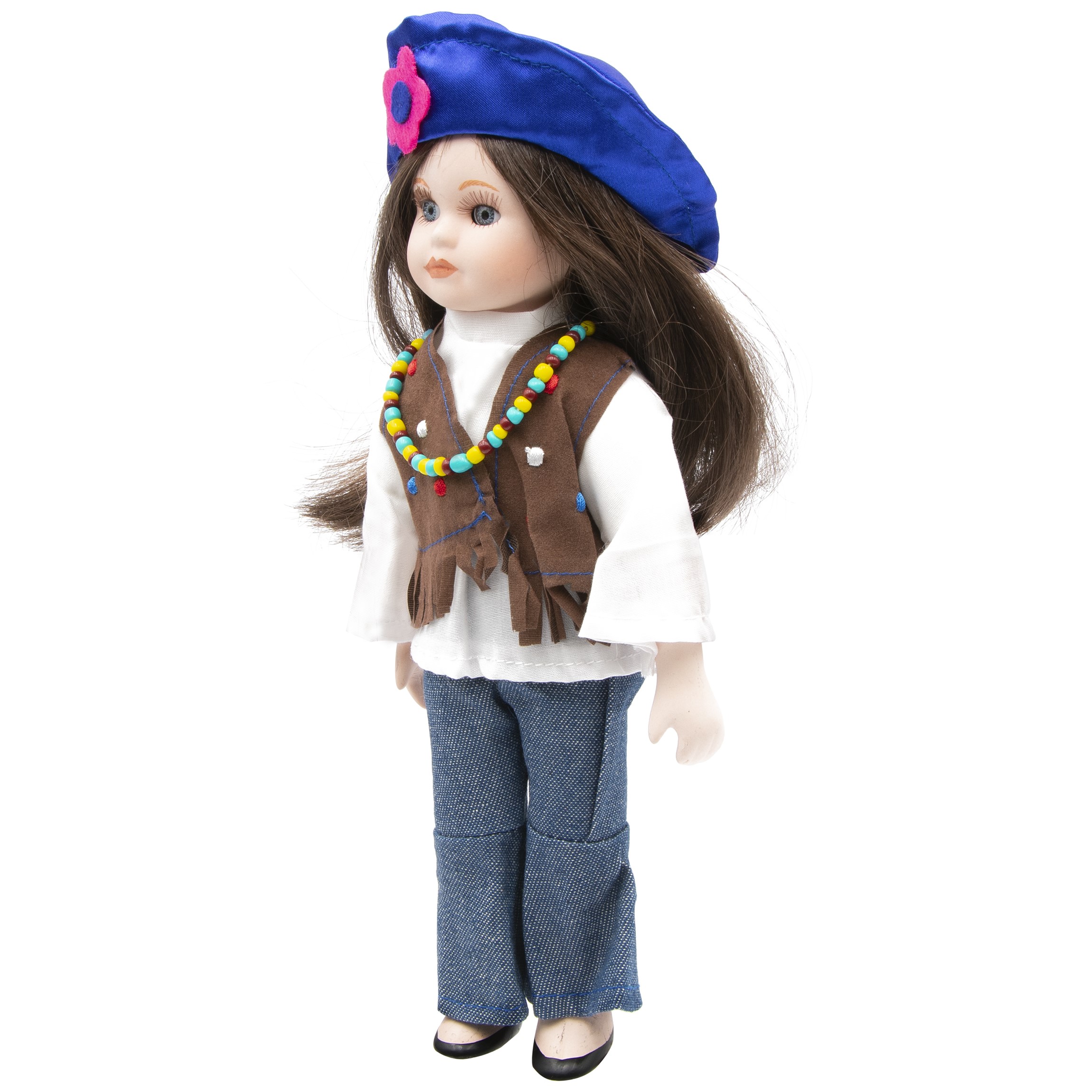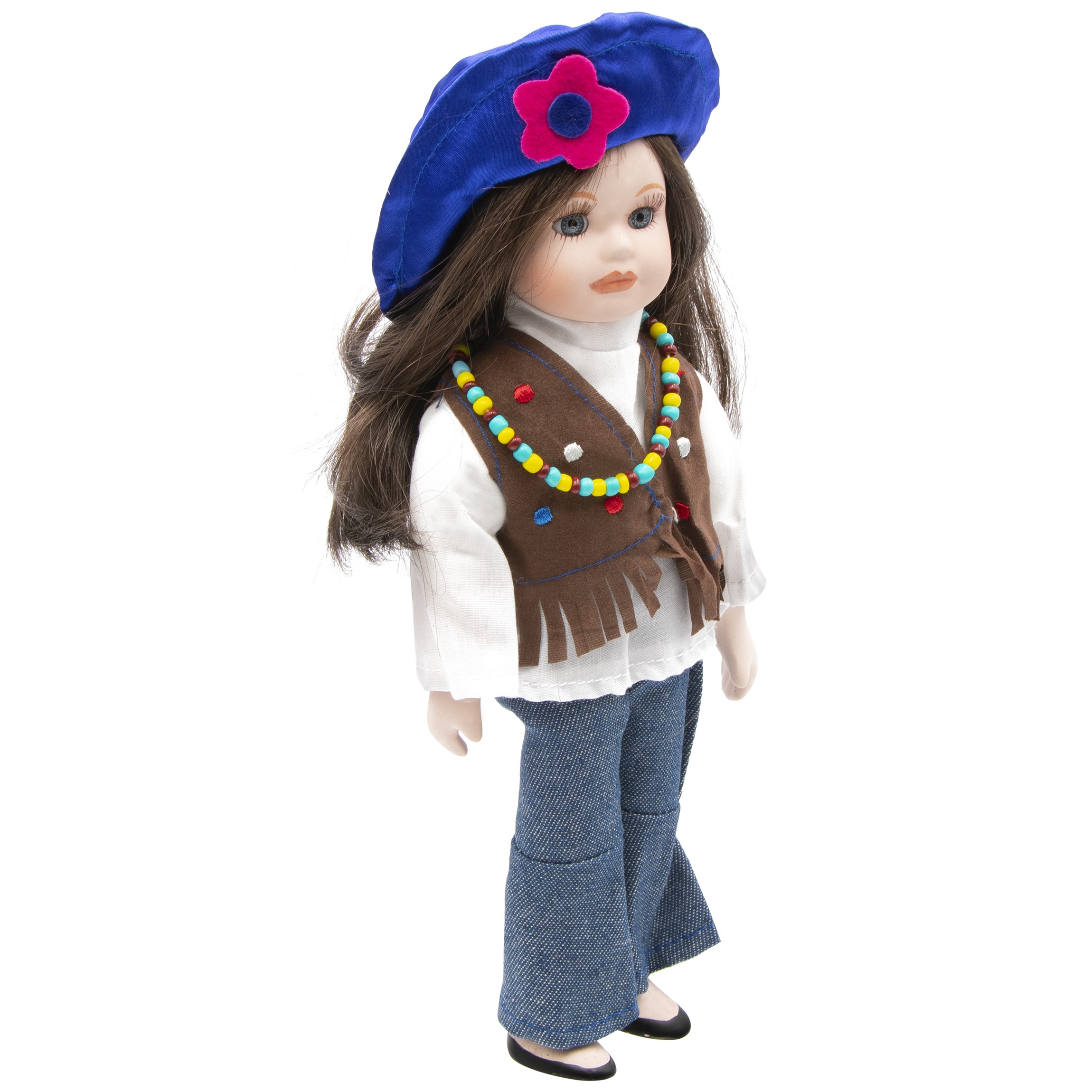 Created by the Royalton Collection these Dolls of the Decade series are a perfect addition to any doll collection. Amy the 70's Boho Fashionista doll is 10" tall with a soft fabric filled body and her head, hands and feet are crafted of bisque porcelain. Her denim and faux leather costume has been hand tailored using the finest fabrics and trimmings. Made in China.