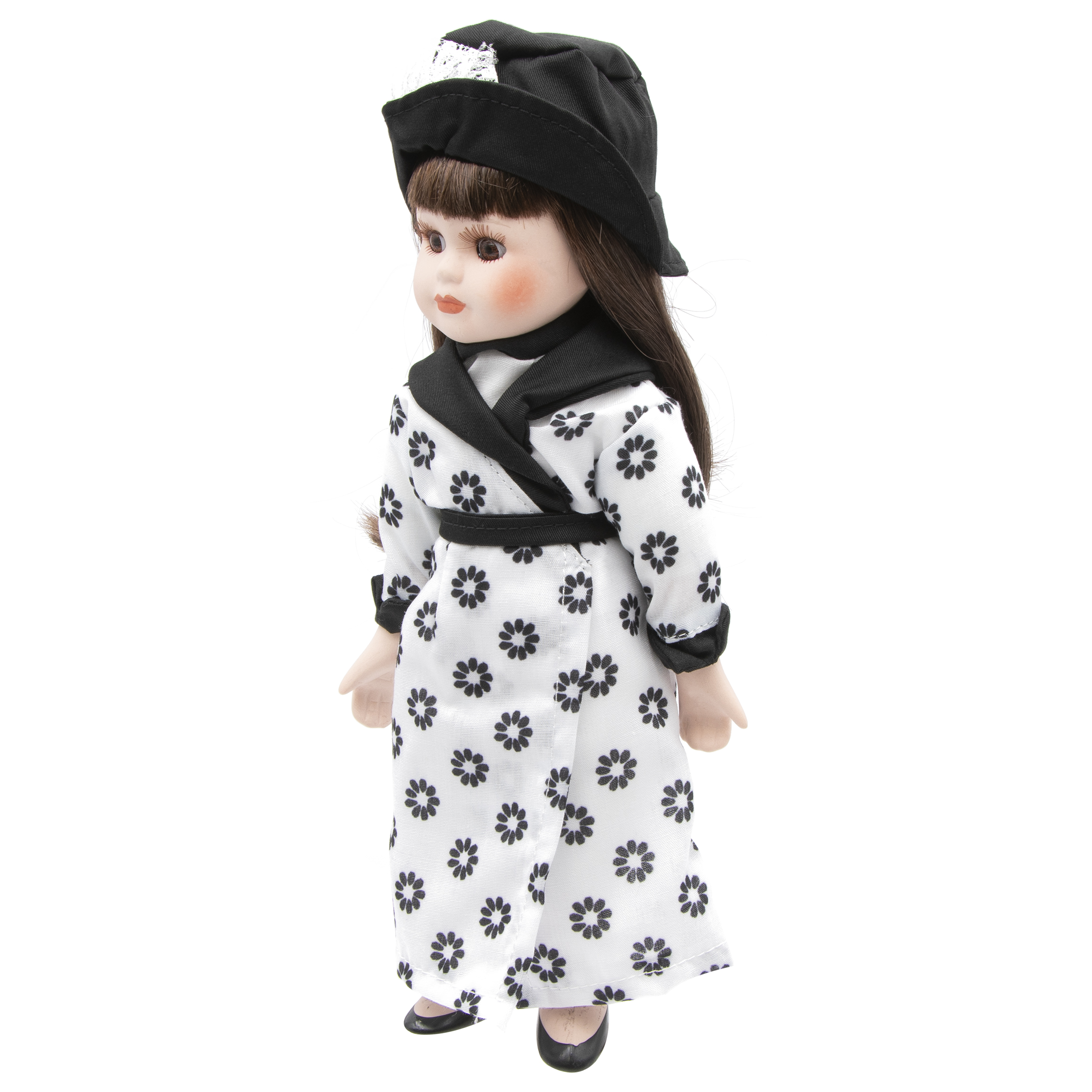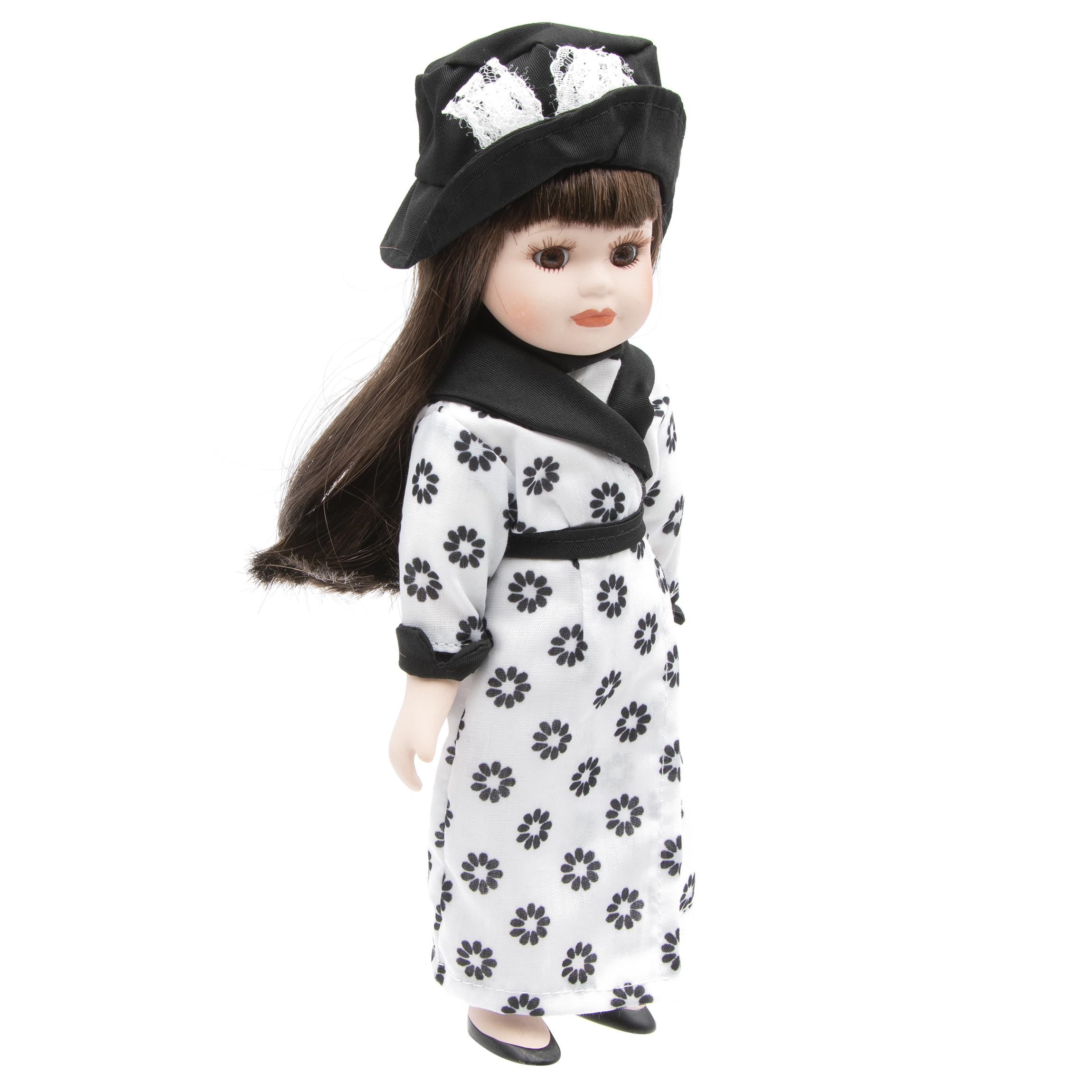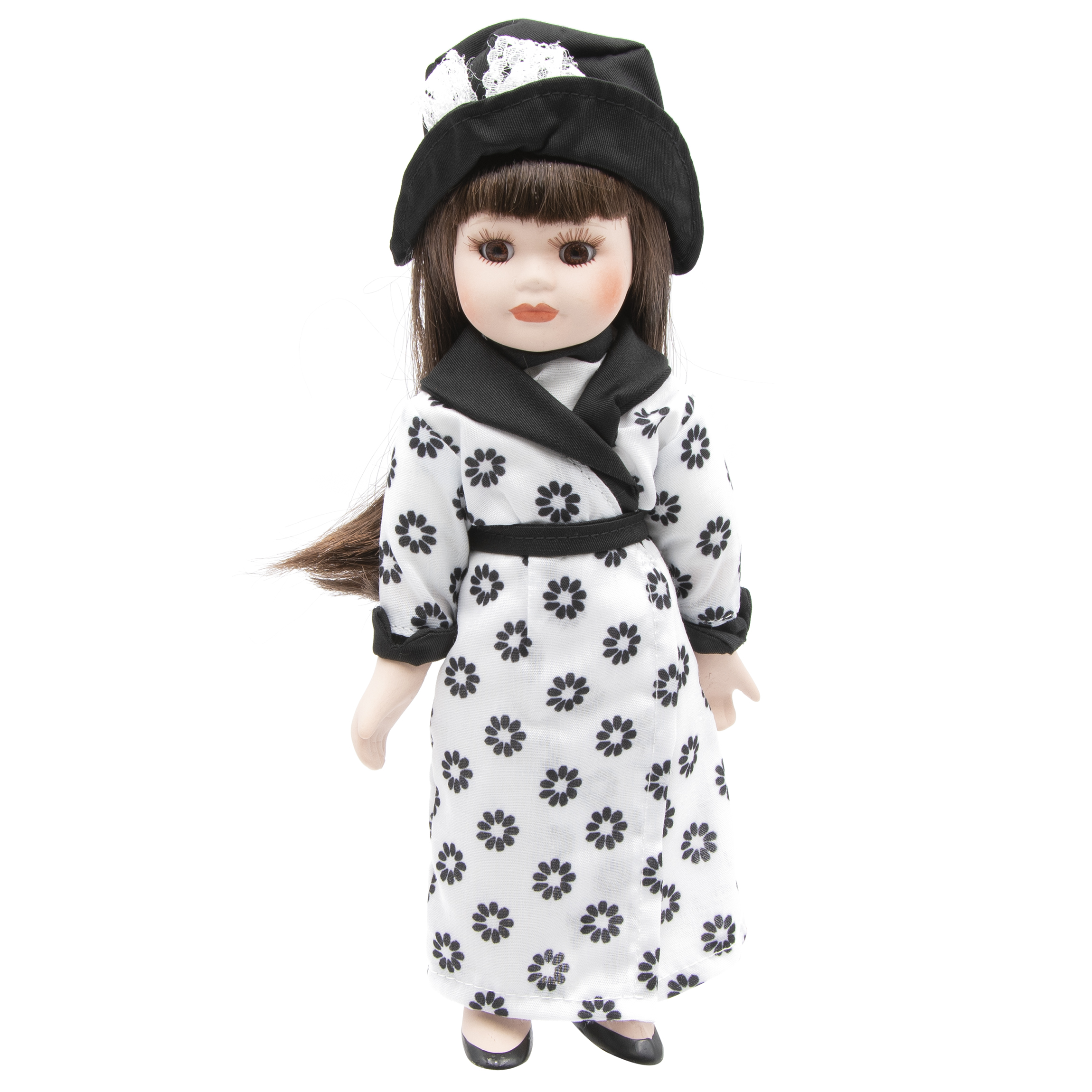 Created by the Royalton Collection these Dolls of the Decade series are a perfect addition to any doll collection. Linda the 40's WWII fashion doll is 10" tall with a soft fabric filled body and her head, hands and feet are crafted of bisque porcelain. Her white and black floral costume has been hand tailored using the finest fabrics and trimmings. Made in China.