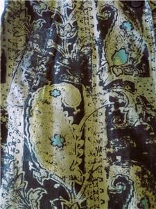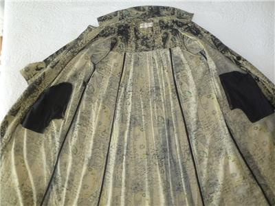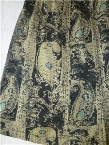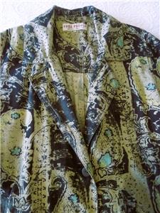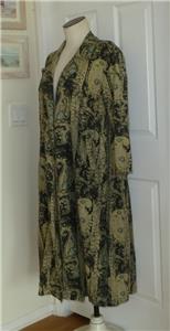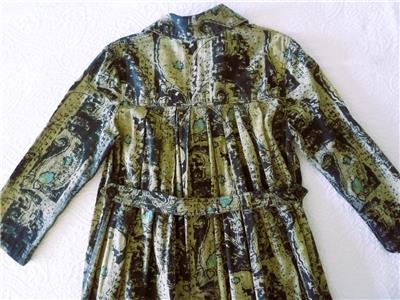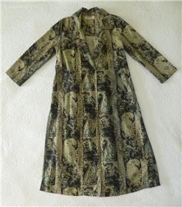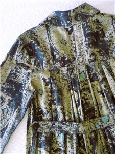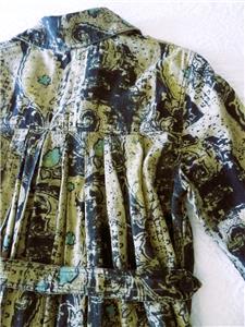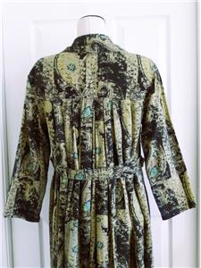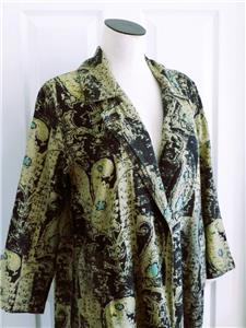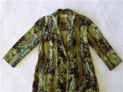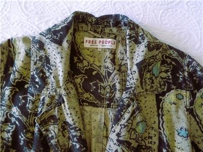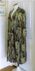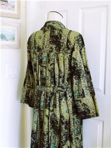 Fabulous midi duster coat from Free People. Tag size XS, oversized, please check measurements below. The fabric/care tag was removed, but I have sold this before. 87% cotton, 13% linen, machine wash, tumble dry. Oversized paisleys in black and sage-tan with aqua floral accents. One-button, V-neck notched lapels, welt front pockets, unlined. Back yoke, pleated below for full draping, held together by the button back belt (optional use). Excellent condition. Original retail $228. Best to review all 24 photos to fully appreciate.