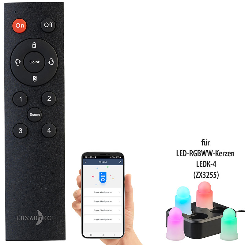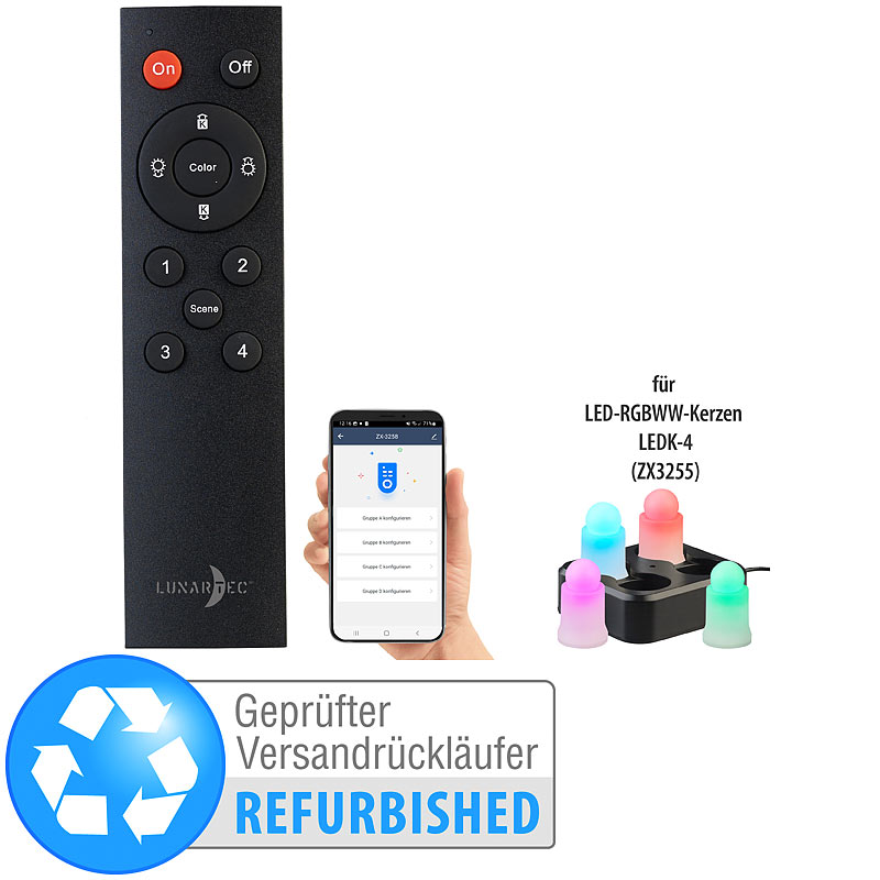 Perfektes Zubehör für Ihre LED-Kerzen: Jetzt steuern Sie Ihre LED-Kerzen auch bequem per Fernbedienung. Einmal mit der Fernbedienung gekoppelt, steuern Sie auf Wunsch bis zu 100 LED-Kerzen in bis zu 4 Gruppen auf einmal!