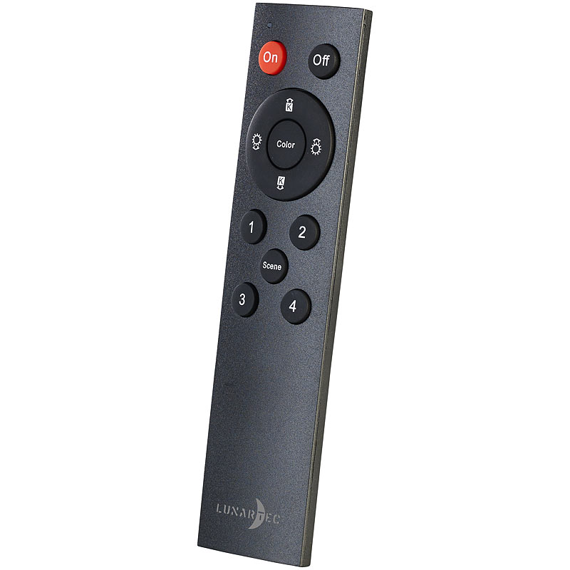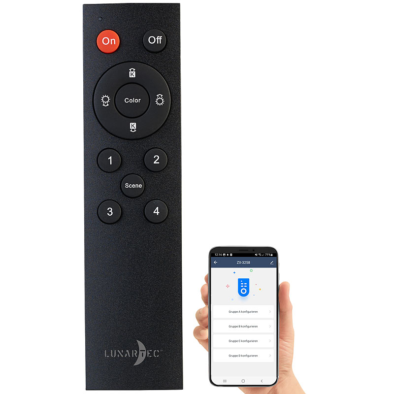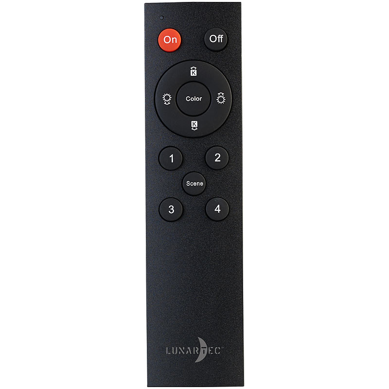 Funktionen der Fernbedienung: ein/aus, Farbauswahl, dimmen, Gruppen- und Szenen-Auswahl