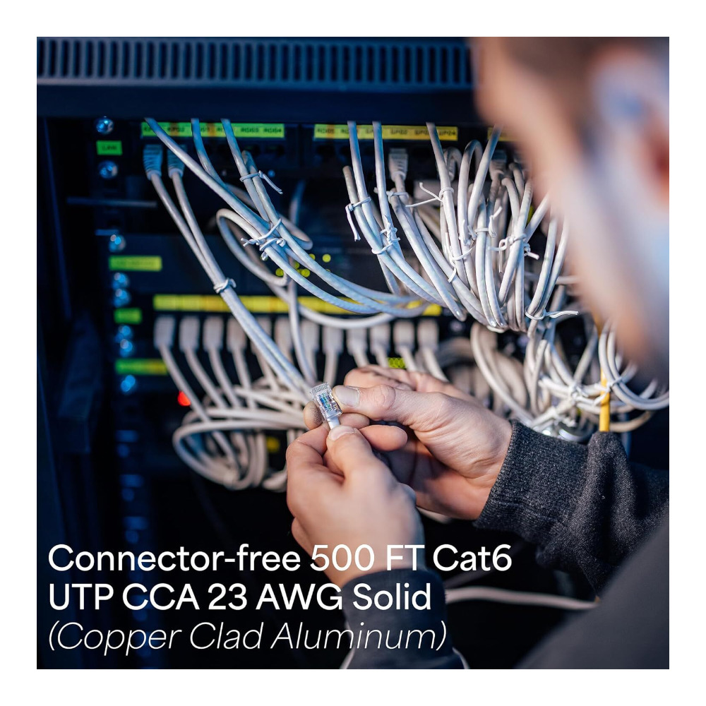 The VIVO 500 ft Cat6 Ethernet Cable with CCA and 23 AWG UTP in a Gray Bulk Pull Box (CABLE-V006) provides a flexible, high-performance solution for indoor LAN network installations. This connector-free cable features 4-pair unshielded twisted pair (UTP) construction with solid copper-clad aluminum (CCA) conductors, allowing users to customize cable length and wiring for patch cables, crossover cables, or other network setups. Housed in an easy-to-use pull box, it simplifies installation while maintaining durability with a UV-resistant outer jacket. Please note this cable is not UL, NEC, ETL, or TIA certified and is not recommended for POE applications.