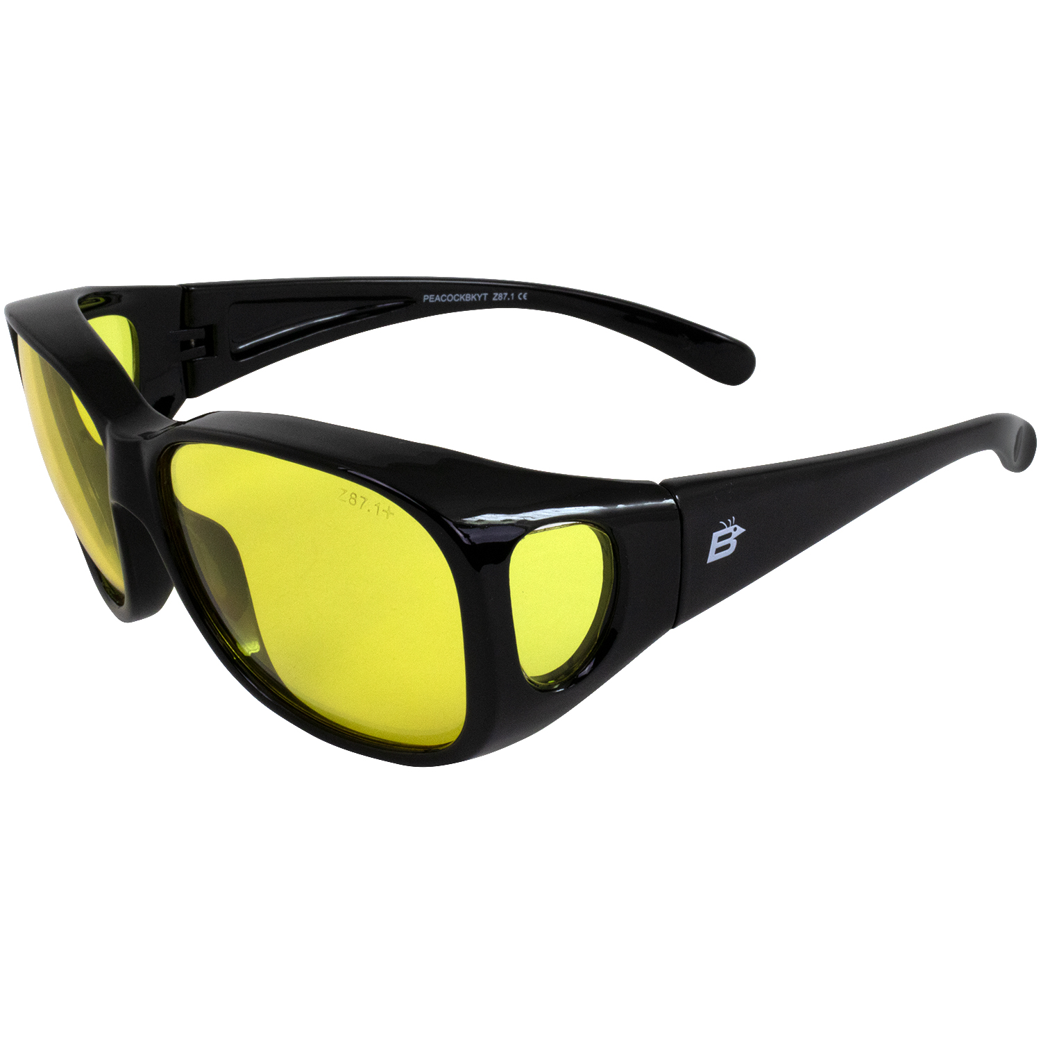On the hunt for a pair of of fitover glasses that actually fit over your regular glasses? Some larger frames are difficult to accommodate on that front, so if you’ve tried numerous pairs to no avail, we’re happy to tell you that your search is over with our Birdz Eyewear Peacock Fitover Glasses. This pair of over-the-glasses frames is 6 inches wide by 2.25 inches high by .25 inches deep, fitting a frame of up to 50mm in height, 140 mm in width. Crafted of high-quality, durable, and flexible nylon for a softer, more comfortable fit, these glasses also feature side windows for a wider range of peripheral vision. Additional features include shatterproof polycarbonate lenses for maximum protection and meet or exceed ANSI Z78.1 safety standards. This pair features black frames with yellow lenses, ideal for lowlight conditions such as dawn, dusk, and rainy days. Glasses are also available in smoke and clear lenses and come complete with a microfiber pouch for safe cleaning and storage.