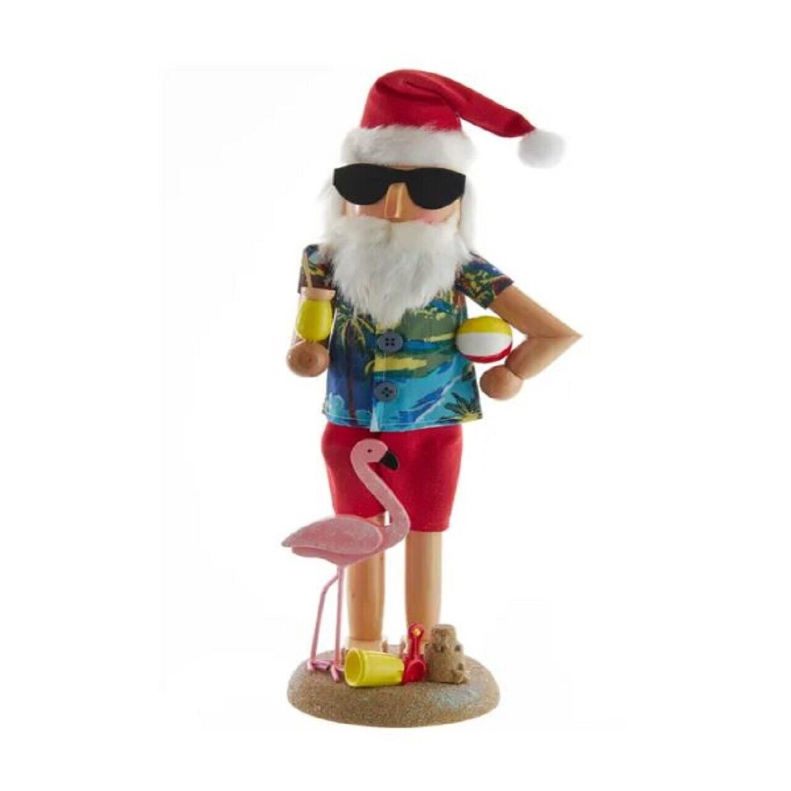 Beach Santa NutcrackerSize is 15.5in HMade from Wood solid, Fabric maché, Wood composite and paintKurt Adler's 15.5 inch Wooden Beach Santa Nutcracker is a fun and festive addition to your holiday décor. This nutcracker features Santa dressed in his best beach attire, while holding a tropical drink in one hand and a beach ball in the other. He is standing on a glittered sand stand with a flamingo and beach toys at his feet.Made by Kurt Adler
